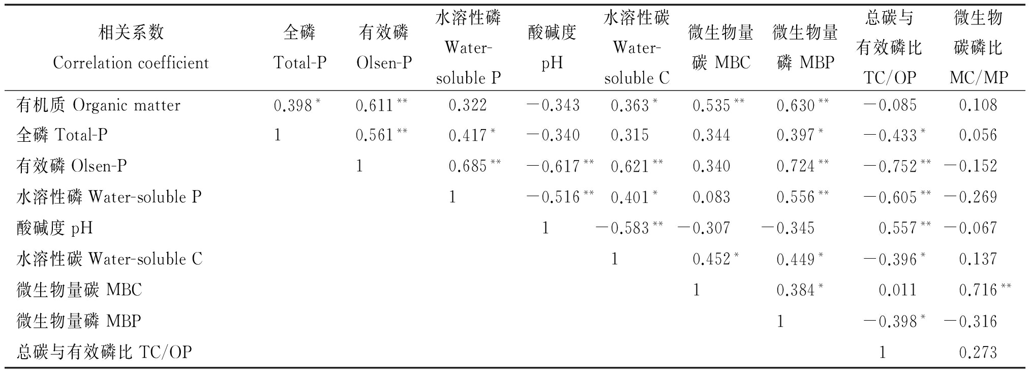 相关系数Correlationcoefficient全磷Total-P有效磷Olsen-P水溶性磷Water-solubleP酸碱度pH水溶性碳Water-solubleC微生物量碳MBC微生物量磷MBP总碳与有效磷比TC/OP微生物碳磷比MC/MP有机质Organicmatter0.398*0.611**0.322-0.3430.363*0.535**0.630**-0.0850.108全磷Total-P10.561**0.417*-0.3400.3150.3440.397*-0.433*0.056有效磷Olsen-P10.685**-0.617**0.621**0.3400.724**-0.752**-0.152水溶性磷Water-solubleP1-0.516**0.401*0.0830.556**-0.605**-0.269酸碱度pH1-0.583**-0.307-0.3450.557**-0.067水溶性碳Water-solubleC10.452*0.449*-0.396*0.137微生物量碳MBC10.384*0.0110.716**微生物量磷MBP1-0.398*-0.316总碳与有效磷比TC/OP10.273
