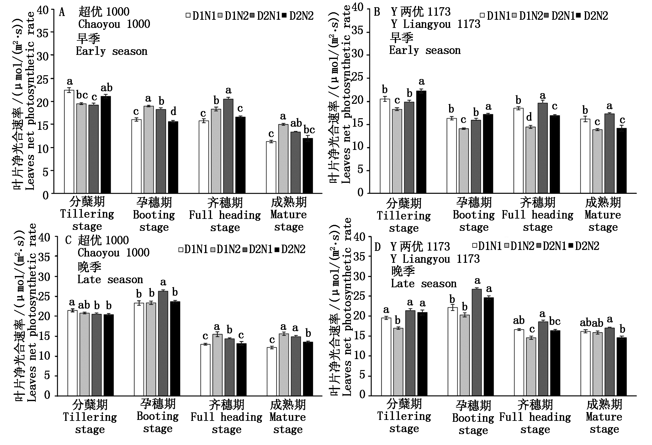 图1表明,不同时期下超优1000和Y两优1173各处理的叶片净光合速率,对超优1000而言,D1处理下,分蘖肥增氮处理降低了分蘖期叶片净光合速率,但提高了齐穗期和成熟期叶片净光合速率。D2处理下,分蘖肥增氮处理降低了早晚季孕穗期、齐穗期和成熟期的叶片净光合速率。对Y两优1173而言,D1处理水平下增加分蘖肥施氮量降低了早晚季各时期叶片净光合速率,而D2处理水平下增加分蘖肥施氮量降低了齐穗期和成熟期的叶片净光合速率。从机插苗数和分蘖肥施氮量交互作用来看,超优1000和Y两优1173在D2N1处理下,在孕穗期、齐穗期和成熟期均保持较高水平的叶片净光合速率,说明增加机插苗数的同时减少分蘖肥施氮量有助于提高植株光合产物的形成和积累。