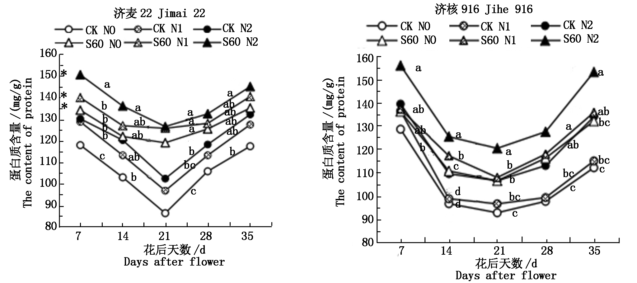 1.3.5 小麦籽粒蛋白质含量测定 于小麦花后7,14,21,28,35 d取小麦穗,105 ℃杀青30 min,80 ℃烘干至恒重,剥其籽粒,磨成小麦粉后,采用半微量凯氏定氮法进行定氮,籽粒蛋白质含量按籽粒含氮量×5.7计算。