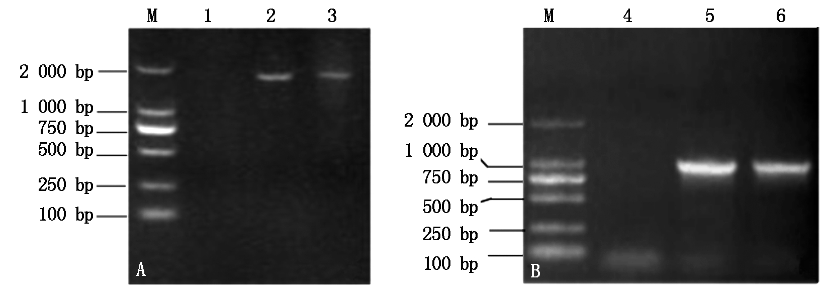 M.DL2000 DNA分子量标准;1, 4.未加模板对照;2-3.DNA模板;5-6.cDNA模板。