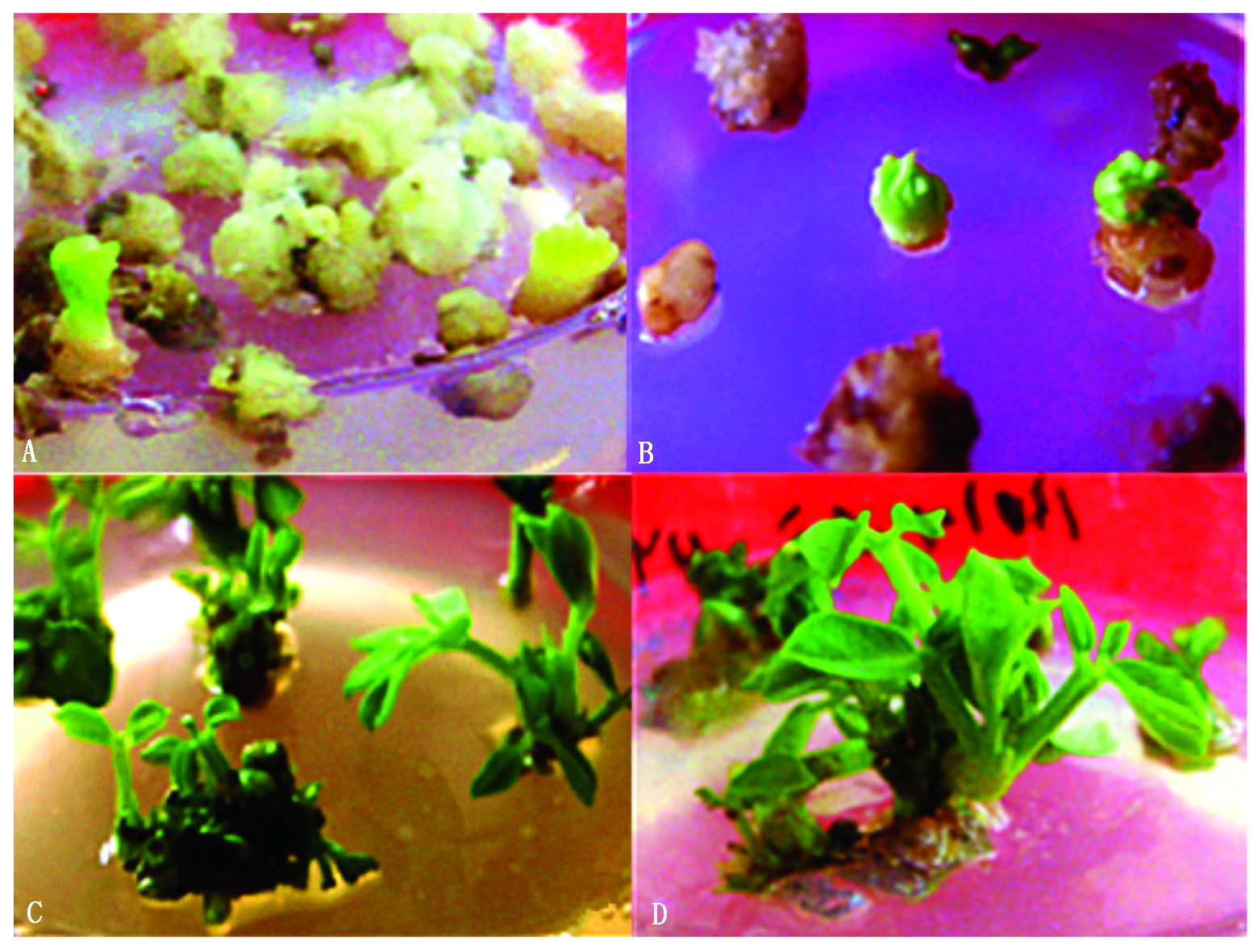 A~B.抗性体胚;C.经伸长培养35~42 d的体胚小苗;D.抗性植株。