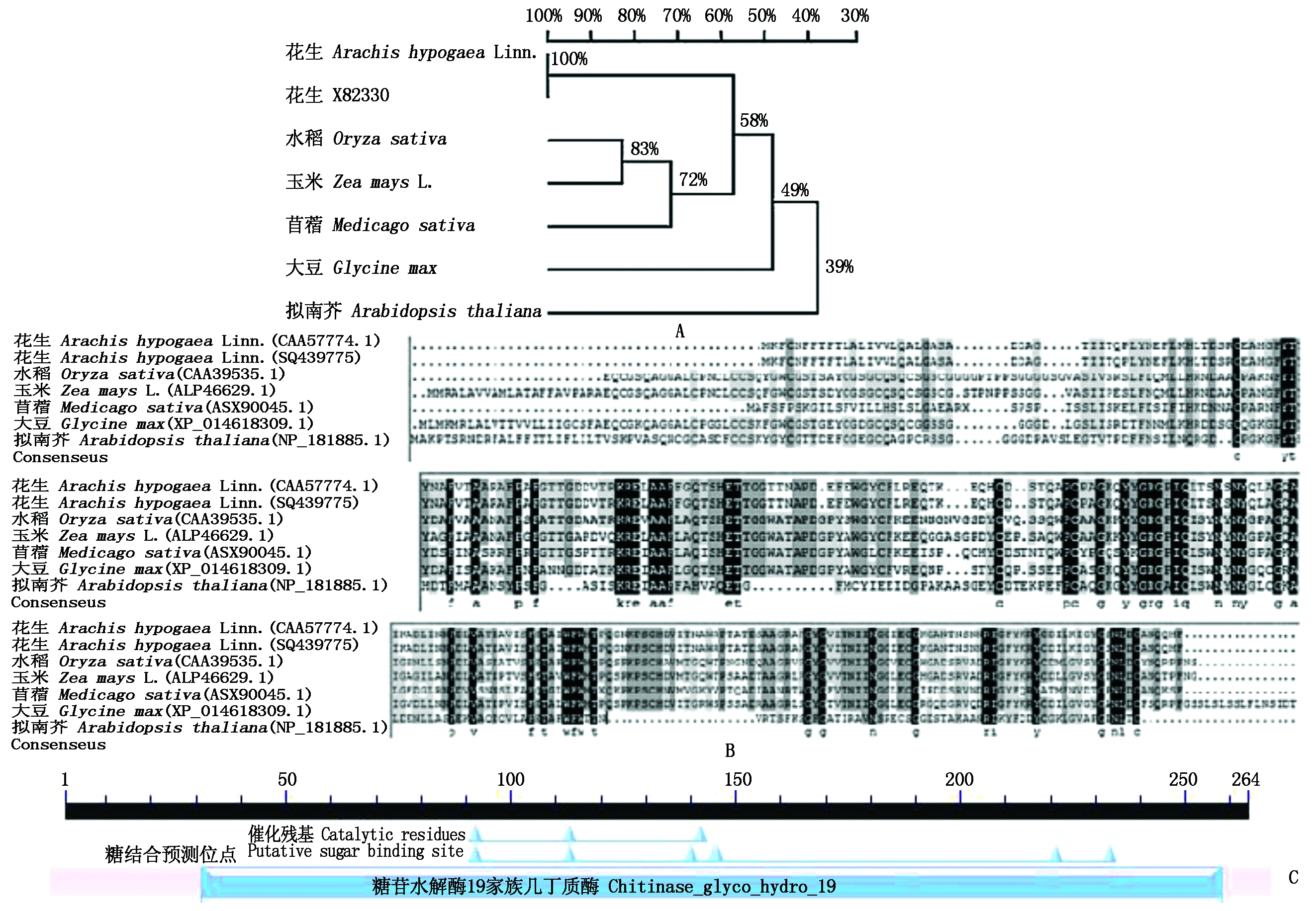 质酶蛋白序列比对结果;C.花生几丁质酶保守结构域预测。