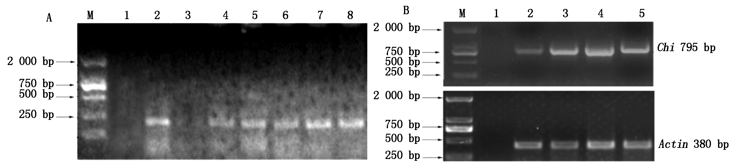 A.Confirmation on transgenic plants by PCR amplification with 35S primers: M.DL2000;1.Control without DNA template;2.pCAMBIA1301-Ah-Chi;3.Non-transgenic plants;4-8.Transgenic plants; B.Ah-Chi expression level determined by RT-PCR amplification:M.DL2000;1.Control without DNA template;2.Non-transgenic plants;3-5.Transgenic plants.