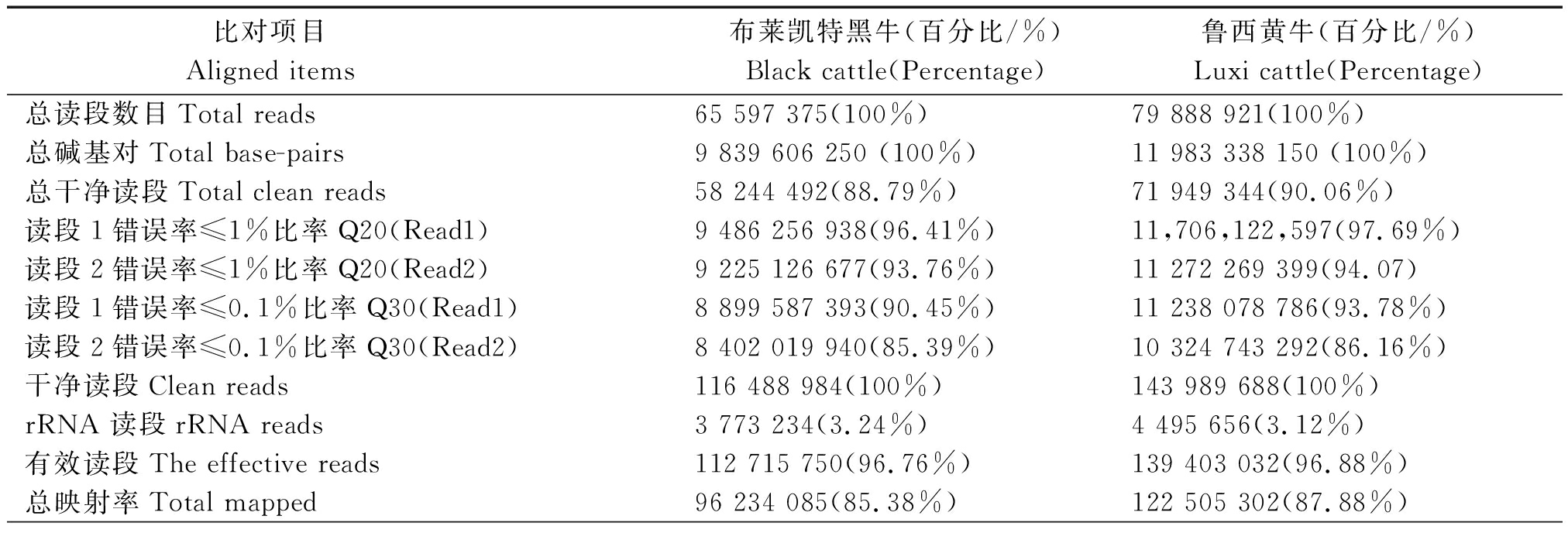 比对项目 Aligned items 布莱凯特黑牛(百分比/%)Black cattle(Percentage)鲁西黄牛(百分比/%)Luxi cattle(Percentage)总读段数目Total reads65 597 375(100%)79 888 921(100%)总碱基对Total base-pairs9 839 606 250 (100%)11 983 338 150 (100%)总干净读段Total clean reads58 244 492(88.79%)71 949 344(90.06%)读段1错误率≤1%比率Q20(Read1)9 486 256 938(96.41%)11,706,122,597(97.69%)读段2错误率≤1%比率Q20(Read2)9 225 126 677(93.76%)11 272 269 399(94.07)读段1错误率≤0.1%比率Q30(Read1)8 899 587 393(90.45%)11 238 078 786(93.78%)读段2错误率≤0.1%比率Q30(Read2)8 402 019 940(85.39%)10 324 743 292(86.16%)干净读段Clean reads116 488 984(100%)143 989 688(100%)rRNA 读段rRNA reads3 773 234(3.24%)4 495 656(3.12%)有效读段The effective reads112 715 750(96.76%)139 403 032(96.88%)总映射率Total mapped96 234 085(85.38%)122 505 302(87.88%)
