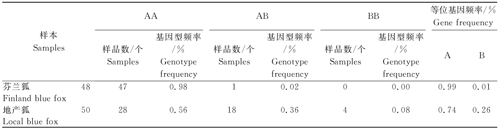样本SamplesAAABBB等位基因频率/%Gene frequency样品数/个Samples基因型频率/%Genotypefrequency样品数/个Samples基因型频率/%Genotypefrequency样品数/个Samples基因型频率/%GenotypefrequencyAB芬兰狐48470.9810.0200.000.990.01Finland blue fox地产狐50280.56180.3640.080.740.26Local blue fox