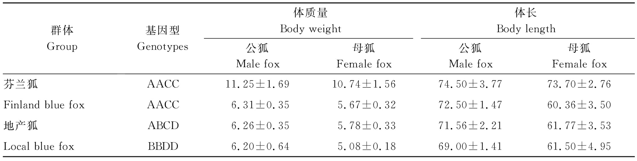 2.4.2 GH基因的遗传参数值 用POPGENE软件计算GH基因不同位点的纯合度、杂合度、多态性信息含量(表4)。试验中芬兰狐基因纯合度为0.979 2,杂合度为0.020 8,地产狐基因纯合度为0.653 8,杂合度为0.346 2,芬兰狐GH基因等位基因的纯合度都比地产狐高。芬兰狐多态信息含量为0.057 9 (0.25 表4 GH基因纯合度、杂合度、多态信息含量和有效等位基因数 群体Group纯合度Ho杂合度Ho有效等位基因数PIC多态信息含量Ne芬兰狐Finland blue fox0.979 20.020 81.021 10.057 9地产狐Local blue fox0.653 80.346 21.625 50.573 1 芬兰狐和地产狐不同基因型之间体质量比较结果见表5。由表5可知,地产狐公狐体质量和体长均为基因型AACC>ABCD>BBDD,母狐则无此趋势。表6对芬兰狐和地产狐全部个体进行分型统计后,运用SPSS 18.0软件分析蓝狐不同基因型与生长性状的相关性。由表6可知,公狐AACC基因型个体体质量显著高于ABCD基因型(P<0.05),而体长则差异不显著(P>0.05);母狐AACC基因型个体体质量极显著高于ABCD基因型个体(P<0.01)且体长显著高于ABCD基因型个体(P<0.05)。 本试验对蓝狐GH基因进行了扩增和测序分析,并且是采用DNA池扩增测序的方法,与常用的单个个体比较测序寻找序列多态的方法相比,单个个体比较测序方法个体数太少不易发现SNPs,且花费成本较高;应用DNA池测序筛查SNPs,切实有效,大大减少了工作量、降低了研究成本 [20-23]。 本试验选用的2个蓝狐资源群体芬兰狐和地产狐体质量、体长具有明显差异,且产区相距较远,具有很好的代表性。本试验利用DNA池对全基因组 表5 GH基因的多态性与体质量体尺性状的相关分析 群体Group基因型Genotypes体质量Body weight体长Body length公狐Male fox母狐Female fox公狐Male fox母狐Female fox芬兰狐AACC11.25±1.6910.74±1.5674.50±3.7773.70±2.76Finland blue foxAACC6.31±0.355.67±0.3272.50±1.4760.36±3.50地产狐ABCD6.26±0.355.78±0.3371.56±2.2161.77±3.53Local blue foxBBDD6.20±0.645.08±0.1869.00±1.4161.50±4.95 表6 不同基因型对体质量、体长性状相关性影响 基因型Genotypes体质量Body weight体长Body length公狐Male fox母狐Female fox公狐Male fox母狐Female foxAACC9.31±2.70a8.87±2.78A73.62±3.17a68.79±7.19aABCD7.01±2.40b5.78±0.33B72.30±3.15a61.78±3.53bBBDD6.20±0.64ab5.08±0.18AB69.00±1.41a61.50±4.95ab 注:同列不同小写字母表示差异显著(P<0.05);不同大写字母表示差异极显著(P<0.01)。 Note: In the same column, values with different small letter mean significant difference(P<0.05);And with different capital letter superscripts mean extremely significant difference(P<0.01). 中GH基因进行检测,从中筛选出2个与体长、体质量可能相关的SNPs位点A306G和T1144C,且首次发现这2个位点完全连锁,共形成AACC 型、ABCD型和BBDD型3个单倍型,基因型频率统计结果显示,芬兰狐中只存在2种基因型,48只样本中47个基因型为AACC,1个样本基因型为ABCD;地产狐3种基因型都存在,50个样本中基因型AACC数量为28,基因型ABCD为18,基因型BBDD为4。2个等位基因频率比较显示A等位基因的频率略高,卡方检验表明,芬兰狐和地产狐因型频率差异极显著(P<0.01)。用POPGENE软件计算GH基因不同位点的纯合度、杂合度、多态性信息含量。结果芬兰狐多态信息含量为0.057 9,属于低度多态位点,地产狐多态信息含量为0.573 1,属于高度多态位点。说明目前芬兰蓝狐的纯度较高,对芬兰蓝狐的系统保种和选育的效果较好,这也与实际情况是一致的,但在检测中发现了一只蓝狐在该位点发生了突变,可能是这几年芬兰蓝狐品种退化的原因之一,需要增加样本测定量来确定。相关性分析结果表明,公狐AACC基因型个体体质量显著高于ABCD基因型(P<0.05),与体长无显著差异(P>0.05);母狐AACC基因型个体体质量极显著高于ABCD基因型个体(P<0.01)且体长显著高于ABCD基因型个体(P<0.05)。结果表明,公狐和母狐体质量和体长在3种基因型间差异情况不同,这可能是由于GH基因对不同性别的蓝狐所起作用并不完全相同造成的。 本试验首次采用直接测序法,研究了地产狐及芬兰狐GH基因的SNPs,以期寻找品种内和品种间的特征SNP和组合基因型及与性状的相关性,从而为蓝狐资源生长发育规律、矮小性状遗传机理、资源保护等方面的研究提供遗传学依据。结果首次发现GH基因中存在2个完全连锁SNPs位点,组成3种单倍型,相关性分析表明可能与蓝狐的体长、体质量存在相关性,但仍有待于进一步研究。 [1] Ashpole N M,Sanders J E,Hodges E L,et al. Growth hormone,insulin-like growth factor-1 and the aging brain[J]. Experimental Gerontology,2014,68:76-81. [2] Chen H C,Wilelmi A E,Howard S C.Purification and characteristics of porcine growth hormone[J]. Journal of Biological Chemistry,1970,245(13):3402-3406. [3] Lantinga-van Leeuwen I S,Oudshoorn M,Mol J A. Canine mammary growth hormone gene transcription initiates at the pituitary-specific start site in the absence of Pit-1[J]. Molecular & Cellular Endocrinology,1999,150(1-2):121-128. [4] Etherton T D,Bauman D E. Biology of somatotropin in growth and lactation of domestic animals[J]. Physiological Reviews,1998,78(3):745-761. [5] Oberbauer A M. The influence of growth hormone on bone and adipose programming[J]. Advances in Experimental Medicine and Biology,2014(814):169-176. [6] Ohkubo T,Araki M,Tanaka M,et al. Molecular cloning and characterization of the yellowtail GH gene and its promoter:a consensus sequence for teleost and avian Pit-1/GHF-1 binding sites[J]. Journal of Molecular Endocrinology,1996,16(1):63-72. [7] Sekar M,Singh S D,Gupta S. Cloning and characterization of Pangasianodon hypophthalmus growth hormone gene and its heterologous e