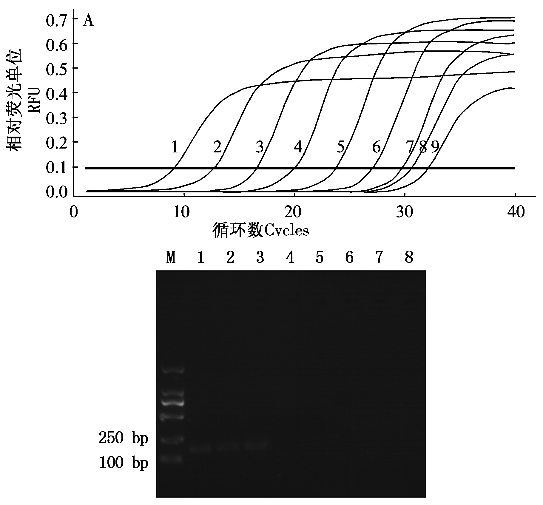 以 3.28×104~3.28×10-3 copies/μL共 8个浓度梯度H-stand质粒为模板进行 Real-time PCR,及普通 PCR。Real-time PCR 检测下限3.28×103 copies/μL (图8-A),而普通 PCR 的检测下限为 3.28×107 copies/μL(图8-B),建立的Real-time PCR 比普通 PCR 灵敏 10 000倍。