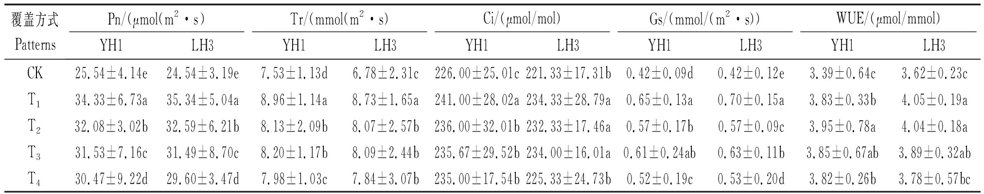 覆盖方式PatternsPn/(μmol(m2·s)Tr/(mmol(m2·s)Ci/(μmol/mol)Gs/(mmol/(m2·s))WUE/(μmol/mmol)YH1LH3YH1LH3YH1LH3YH1LH3YH1LH3CK25.54±4.14e24.54±3.19e7.53±1.13d6.78±2.31c226.00±25.01c221.33±17.31b0.42±0.09d0.42±0.12e3.39±0.64c3.62±0.23cT134.33±6.73a35.34±5.04a8.96±1.14a8.73±1.65a241.00±28.02a234.33±28.79a0.65±0.13a0.70±0.15a3.83±0.33b4.05±0.19aT232.08±3.02b32.59±6.21b8.13±2.09b8.07±2.57b236.00±32.01b232.33±17.46a0.57±0.17b0.57±0.09c3.95±0.78a4.04±0.18aT331.53±7.16c31.49±8.70c8.20±1.17b8.09±2.44b235.67±29.52b234.00±16.01a0.61±0.24ab0.63±0.11b3.85±0.67ab3.89±0.32abT430.47±9.22d29.60±3.47d7.98±1.03c7.84±3.07b235.00±17.54b225.33±24.73b0.52±0.19c0.53±0.20d3.82±0.26b3.78±0.57bc