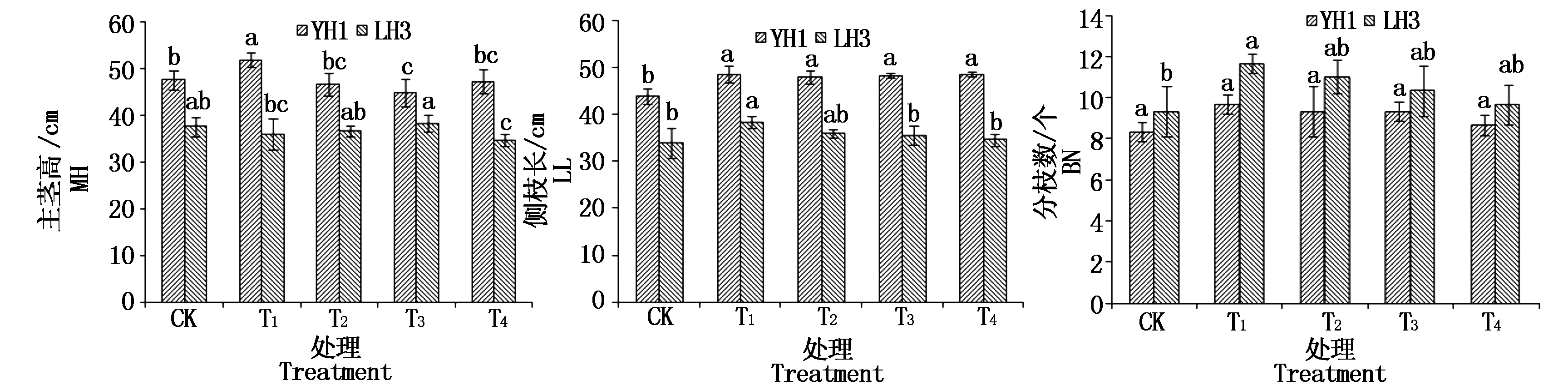 从图1可知,不同覆盖方式对黑花生主茎高(MH)、侧枝长(LL)、分枝数(BN)3个形态性状的影响作用表现为:全膜覆盖(T1)要优于其余3种方式和对照(CK),半膜覆盖(T2)和全秸秆覆盖(T3)的增促效果基本接近(P>0.05)。豫花黑1号的主茎高、侧枝长要大于临黑3号,而临黑3号不同处理下的分枝数要多于豫花黑1号。