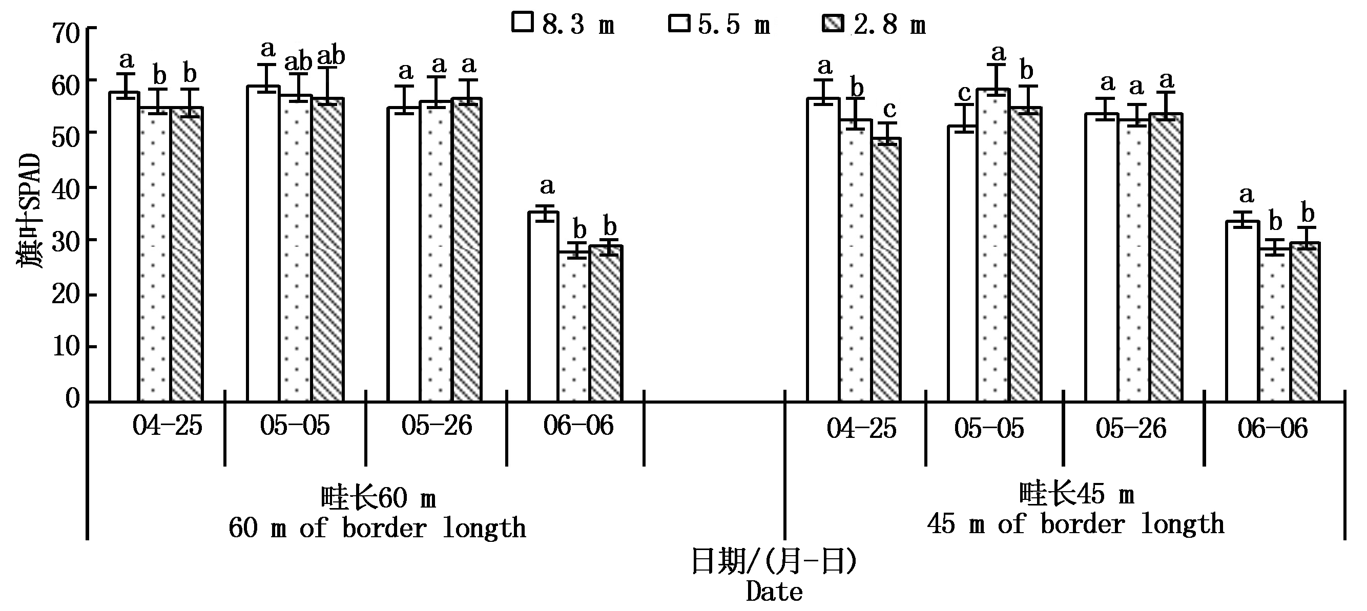 由不同畦宽处理对旗叶SPAD值的影响可见(图2),畦长60.0 m时4月25日和6月6日8.3 m畦宽处理旗叶SPAD值显著高于其他2个处理,2个时期分别高5.9%,30.5%,而5月5,26日不同处理间SPAD值差别不明显。畦长45 m时,4月25日和6月6日8.3 m畦宽处理旗叶SPAD值显著高于其他2个畦宽处理,两时期分别高11.8%和23.1%;5月5日则表现为畦宽5.5 m处理旗叶SPAD值较高,较2.8,8.3 m处理分别高13.4%和6.1%。可见畦宽8.3 m处理旗叶SPAD值总体较高,尤其是生育后期更为明显。