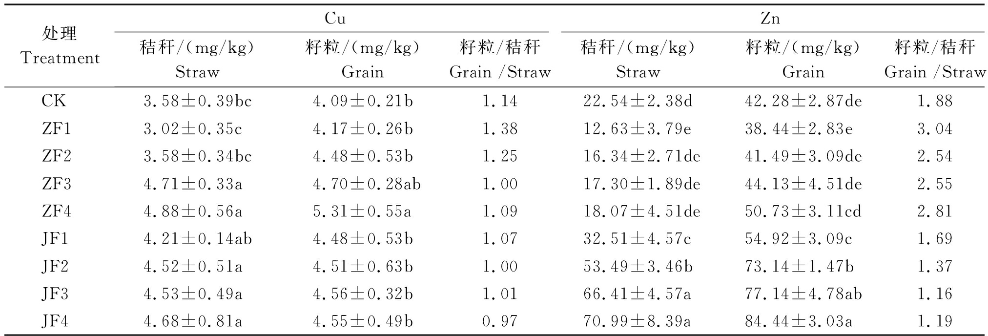 处理TreatmentCuZn秸秆/(mg/kg)Straw籽粒/(mg/kg)Grain籽粒/秸秆Grain /Straw秸秆/(mg/kg)Straw籽粒/(mg/kg)Grain籽粒/秸秆Grain /StrawCK3.58±0.39bc4.09±0.21b1.1422.54±2.38d42.28±2.87de1.88 ZF13.02±0.35c4.17±0.26b1.38 12.63±3.79e38.44±2.83e3.04 ZF23.58±0.34bc4.48±0.53b1.25 16.34±2.71de41.49±3.09de2.54 ZF34.71±0.33a4.70±0.28ab1.00 17.30±1.89de44.13±4.51de2.55 ZF44.88±0.56a5.31±0.55a1.09 18.07±4.51de50.73±3.11cd2.81 JF14.21±0.14ab4.48±0.53b1.07 32.51±4.57c54.92±3.09c1.69 JF24.52±0.51a4.51±0.63b1.00 53.49±3.46b73.14±1.47b1.37 JF34.53±0.49a4.56±0.32b1.01 66.41±4.57a77.14±4.78ab1.16 JF44.68±0.81a4.55±0.49b0.97 70.99±8.39a84.44±3.03a1.19