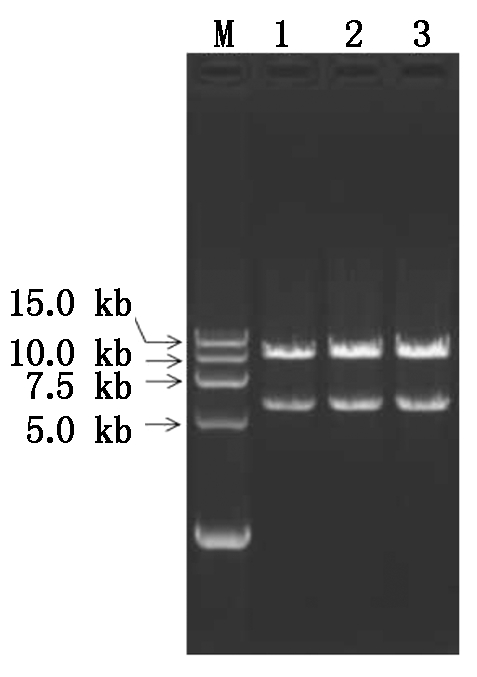 OsAnn8靶位点基因编辑植物表达载体的具体构建方法如图4所示,首先使用快切限制性内切酶EcoR Ⅰ和Hind Ⅲ双酶切测序正确的OsAnn8靶位点的重组质粒Cas9-OsAnn8,1%的琼脂糖凝胶上电泳分离后, 纯化回收携带Cas9核酸剪切酶基因和引导RNA序列的5.6 kb DNA片断,与经限制性内切酶酶切后同样携带EcoR Ⅰ和Hind Ⅲ黏性末端的pSK51植物表达载体进行连接反应,热激转化大肠杆菌后涂板,15 h后挑取3个单菌落克隆摇菌,然后抽提质粒DNA,同样使用上述2个限制性内切酶(EcoR Ⅰ和Hind Ⅲ)进行质粒克隆的阳性鉴定,结果表明,3个单菌落克隆酶切后都出现了一条约11 kb的载体大片段和一条约5.6 kb的插入片段,说明 OsAnn8的CRISPR/Cas9基因编辑植物表达载体pSK51-Cas9-OsAnn8已经成功构建(图5)。