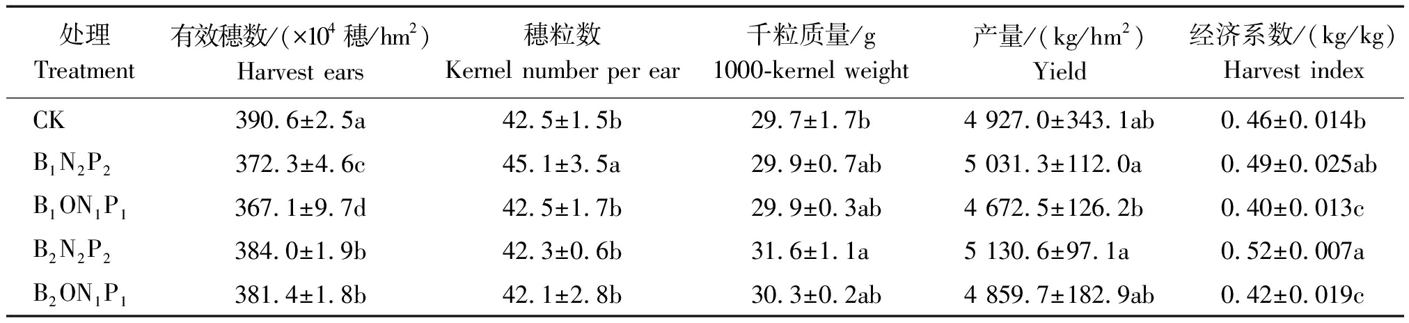 处理Treatment有效穗数/(×104穗/hm2)Harvest ears穗粒数Kernel number per ear千粒质量/g1000-kernel weight产量/(kg/hm2)Yield经济系数/(kg/kg)Harvest indexCK390.6±2.5a42.5±1.5b29.7±1.7b4 927.0±343.1ab0.46±0.014bB1N2P2372.3±4.6c45.1±3.5a29.9±0.7ab5 031.3±112.0a0.49±0.025abB1ON1P1367.1±9.7d42.5±1.7b29.9±0.3ab4 672.5±126.2b0.40±0.013cB2N2P2384.0±1.9b42.3±0.6b31.6±1.1a5 130.6±97.1a0.52±0.007aB2ON1P1381.4±1.8b42.1±2.8b30.3±0.2ab4 859.7±182.9ab0.42±0.019c