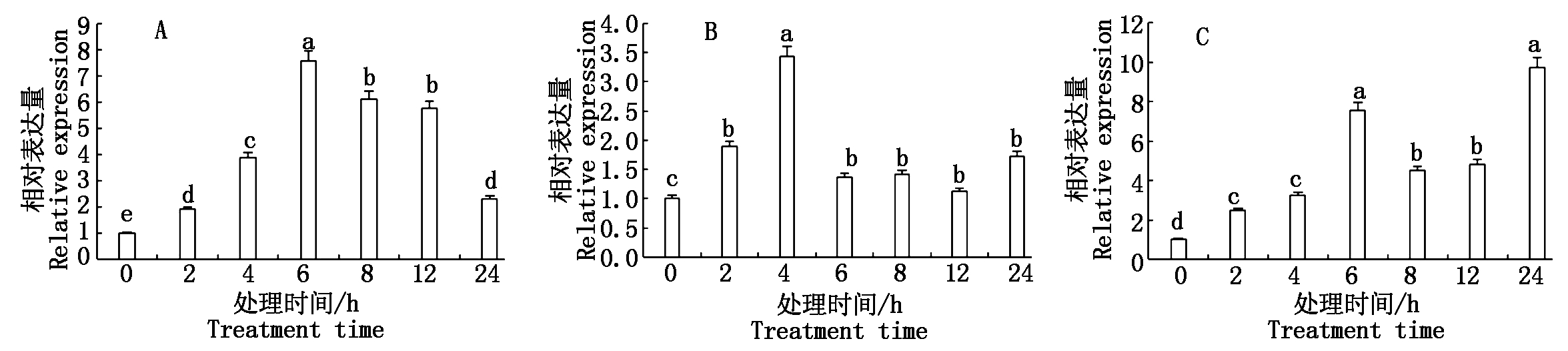 Different lowercase letters represent significant differences(P<0.05).A.250 mmol/L NaCl treatment; B.15% PEG treatment; C.ABA treatment.