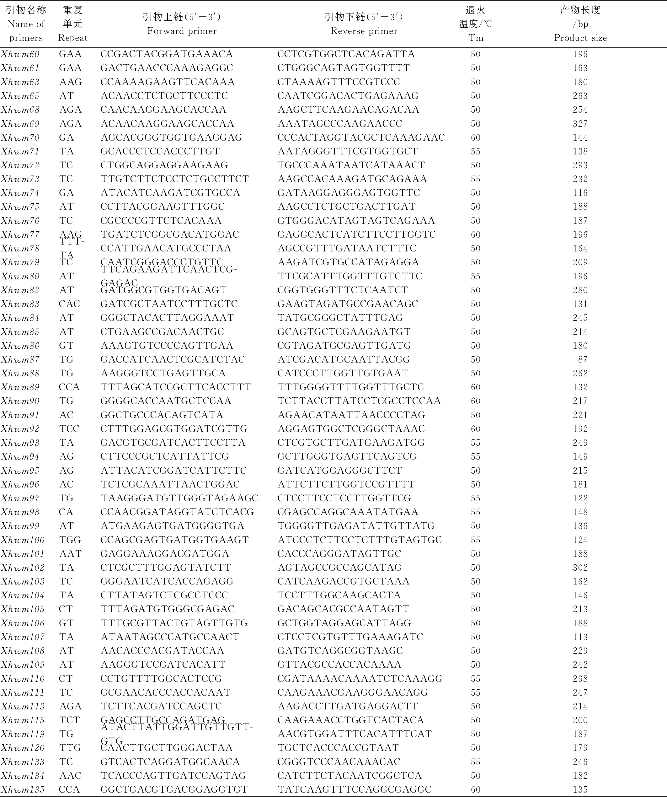 引物名称Name ofprimers重复单元Repeat引物上链(5'-3')Forward primer引物下链(5'-3')Reverse primer 退火温度/℃Tm 产物长度/bpProduct size Xhwm1ATTAAATAGATAATCAGTTCCA-CACTTATAGGGCTGCTGTGA50209Xhwm2ACATAAACAAGCATTATACAGCACTCCTCCCCTTTCCTTCT50212Xhwm3GAATAGCAAAGCTCACGGTACGATGAGGAGGGAGTTGTTC50137Xhwm4ATGCCACCACCAACTTTCTCTAGGGTCCGATCACATTC50274Xhwm5TCACGAGGAGGGAGTAGTTCACCATTACAAGAAAGTAGAGGG50208Xhwm6ATCAAAACGCAAACGGTGGTGCTTGGGCTGGTTTGAGT55248Xhwm8TGGGAAACTTATTGTTGGTATGAAATAGGCCAGCCCAGTA50202Xhwm11CCTCCCTTGCCACGTTCAGTCGGGAGGAATGGGACTCGGATGT60168Xhwm12ATTTTGGAAATGGAAAGACAGCACCCACATCATCTTCCTG50248Xhwm13TACACAGGGTGAGGCTGACTTTAGCACGGGAGACCTATT50286Xhwm14TCCCATGACAAGGAGGGAGTCATCAAGATCGTGCCATAGA50141Xhwm16ACTCCCCGAGCCCATACACCCATCTAACATGCATTCATAC50161Xhwm17GAATGGTGCCAGGGCAGAATTGAAGATGGCGGAGGTGTT55280Xhwm18GACGTGCCAAATCAAGAACACATCATCCCGACGCTCT50121Xhwm20ACACAGGAGCGTGAAATAGAAGCCTTGATTGGCCTCCCT50188Xhwm21AGACAGGAGCGTGAAATAGAAGAAGATGGGAGGAGGTTTCC55169Xhwm22ACCGCAATCGGAGTTATGGGATGGGAGGAGGTTTCC50244Xhwm23AGCAGGAGCGTGAAATAGAAGAAGATGGGAGGAGGTTTCC55190Xhwm24GAGACAACGAAATCTCAAAGGTCATCATCCCGATAGCC50231Xhwm25CTGGGGACGGTGCTATCCAATGGCGGACCTGGCACTCAAAT60173Xhwm26TGATGTCAAGCGTCTGAGGAAGAGTCATGTACTGACCGTGAGAC55217Xhwm27CAATGGAAATGTGGGTTTGTCCACATCCTCCCTTTCTGC50154Xhwm28TATTCACTGTTTCCGTCGTTAGGGTCCGATCACATTC50158Xhwm29TCATCTCGGCGGTCTCCATCGTGCCAAATCAAGAACAA55131Xhwm30ATCATGAAGTCCTTTACCCTGGAAGTGCTGGTGAAGATGTTGATG55218Xhwm31TGTGTTGTTGTTGCTGCTGTTGCGGGCTGATGGCAAGGATA55128Xhwm32TCCTCGGAGCTGAGGGTATGATCCGATAAGATAACT-TCAAGAGG55195Xhwm33CTTCCCAAGTGACACCTAACCTCCTACCCAAGCCAAA50158Xhwm34GGACCCCGGAAGGAAACAACCCGGTCCCGATCATGCGAAACTC60176Xhwm35AGAATCCAATCTCAGTCCCTTTCATGTTCTTTCCTCCC50282Xhwm36TACAATGACCTATGGCACCTTGGGATTGAGTTGGAGGA50320Xhwm37TT-GCCACTTGTTGTTGGGTAAATGTCCCACATCCCAGTCAGTCTTCA55227Xhwm38CCGTTGTCTTACATGGTAT-CACGCTAGGAGAAGTGCCGCGAGGGAG60190Xhwm39GACATCAAGATCGTGCAACAGTCATTGACGAGAAGGGAGT50119Xhwm40TTGAAAGCCCATAAACATCCGGCAGCAGAATGCCTTGAT50198Xhwm41ATACGTAAAATTACGGTGCACTCGTCGTCAAAATGATGTA50251Xhwm43CTCCTCAAGAAATTCTGCGTGTTCGCCGTAATGTTGGTCTATGC60273Xhwm48ATCGAAAGAACCGTGGACTATGATCTTGAGGAGGTGTT50166Xhwm50CATACCCACCTCAAGGCCACACGCCGTCTTTGATCTACTCG60296Xhwm51GAAAGTGGAAGCACGAGTGTACAACTCCTGCTTTCACTC50190Xhwm52TAGGTTGGACGAACGACAGTACAACCACCTGAAACC50165Xhwm53GAGTCGTAATGTTGCTCTATGCTCTACGTGTTGCTTTTGTC50258Xhwm54TATATTCTCAAGATCAGAGGGTATCCCGTAGATGTGAATTTTG50192Xhwm55GACCGATAAGATAACTTCAAAGGCATCATACCAGGGCTCTTC50240Xhwm57CACGAGGAACCATCCATTTGCAAGCCTCCTCGTTAGAC50208Xhwm58TCACGAGGAGGGAGTAGTTCACATCAAGATCATGCCATAGA50108Xhwm59AGCTGAATCCGTCGGTCTGATGCGACATTTGTGAGTTG50217