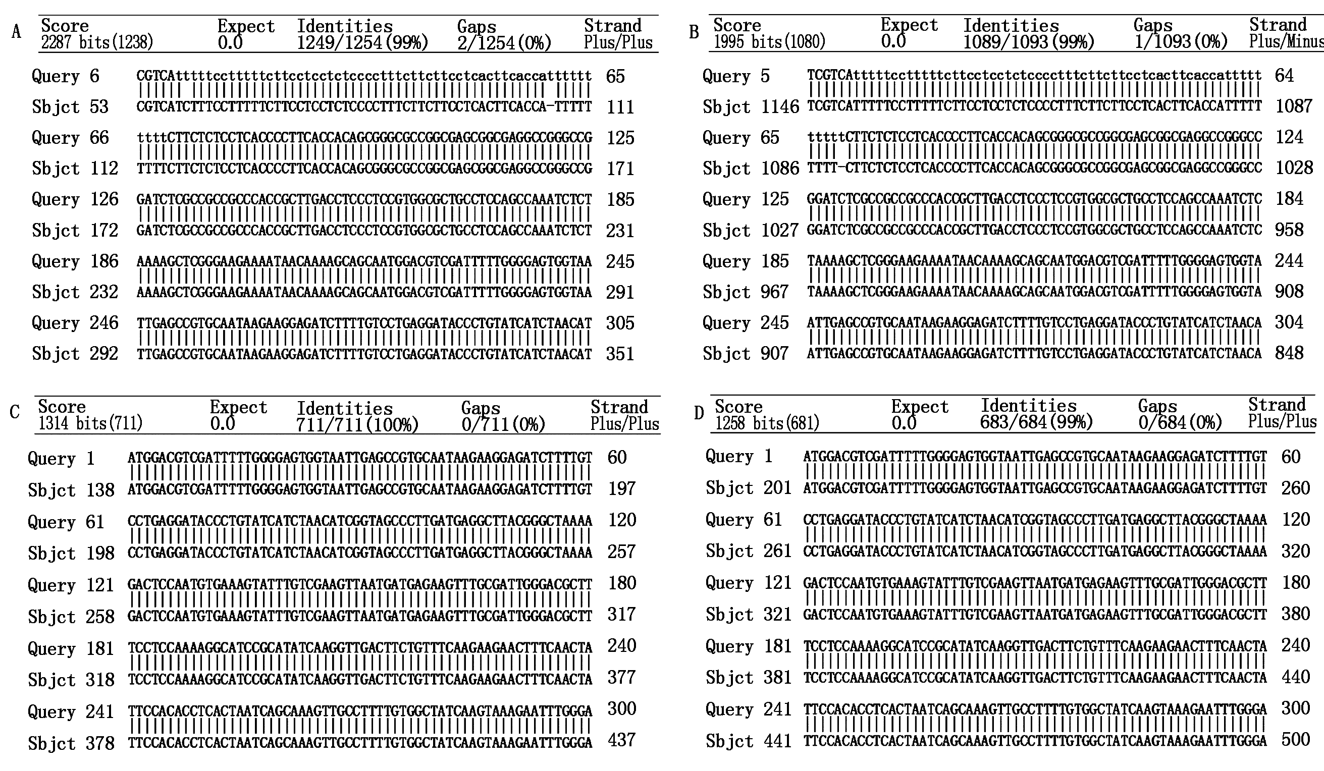 挑选上述若干单克隆阳性菌落摇菌,提取质粒送北京擎科新业生物科技公司进行测序,测序结果在NCBI上进行Blast分析,比对结果如图4。其中,图4-A-B显示引物对mF/m12R扩增到的产物中分别有1和2号剪切体的存在;图4-C-D显示引物对CDSF/CDS345R扩增到的产物中分别有3、4和5号剪切体的存在。3号剪切体和4号剪接体CDS序列完全相同,未能区分,可能存在一种或者二者均存在。至此,结果显示,OsHDT703基因预测的5种可变剪接体中,至少存在4种不同的可变剪接体。