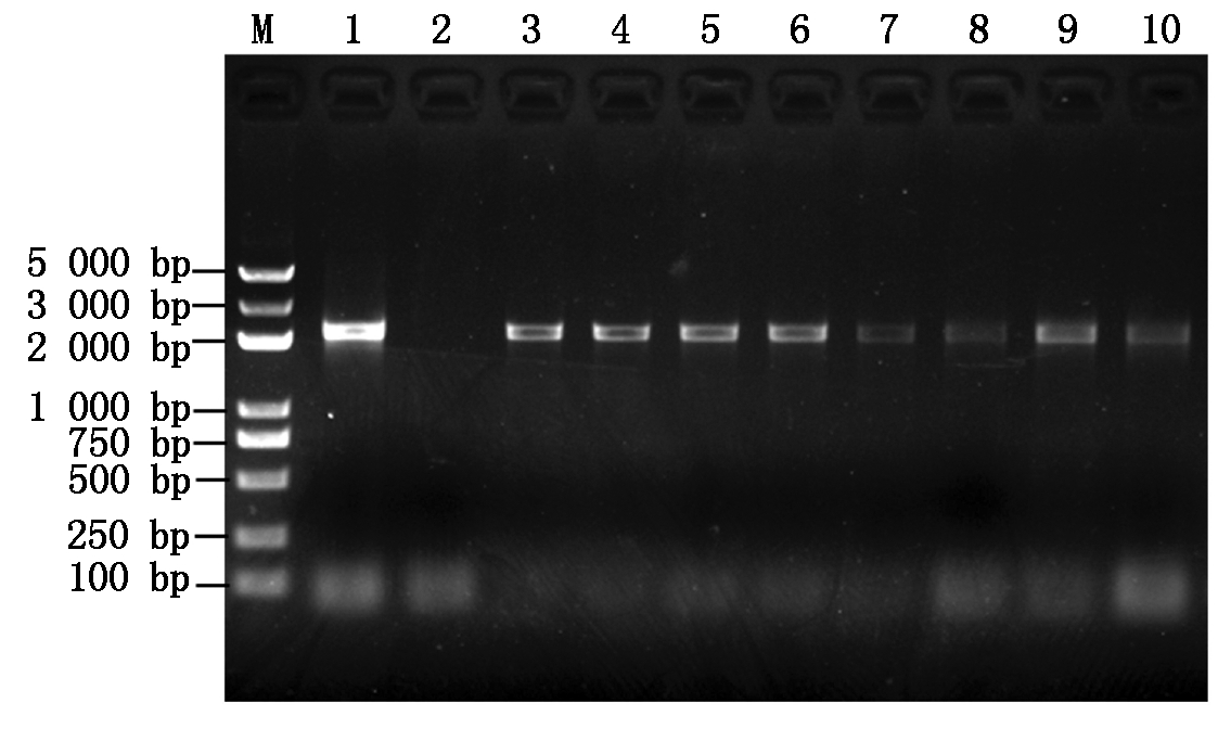 (阳性对照);2.野生型拟南芥(阴性对照);3-10.转基因拟南芥。
