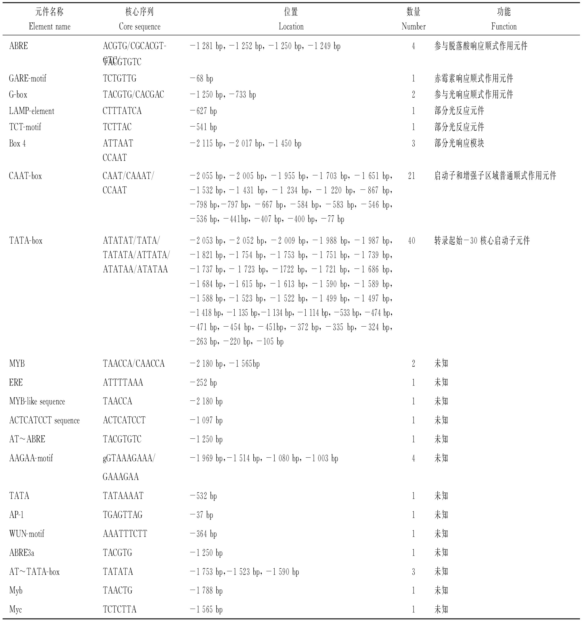 元件名称Element name核心序列Core sequence位置Location数量Number功能FunctionABREACGTG/CGCACGT-GTC/-1 281 bp, -1 252 bp, -1 250 bp, -1 249 bp4参与脱落酸响应顺式作用元件TACGTGTCGARE-motifTCTGTTG-68 bp1赤霉素响应顺式作用元件G-boxTACGTG/CACGAC-1 250 bp, -733 bp2参与光响应顺式作用元件LAMP-elementCTTTATCA-627 bp1部分光反应元件TCT-motifTCTTAC-541 bp1部分光反应元件Box 4ATTAATCCAAT-2 115 bp, -2 017 bp, -1 450 bp3部分光响应模块CAAT-boxCAAT/CAAAT/CCAAT-2 055 bp, -2 005 bp, -1 955 bp, -1 703 bp, -1 651 bp, -1 532 bp, -1 431 bp, -1 234 bp, -1 220 bp, -867 bp, -798 bp, -797 bp, -667 bp, -584 bp, -583 bp, -546 bp, -536 bp, -441bp, -407 bp, -400 bp, -77 bp21启动子和增强子区域普通顺式作用元件TATA-boxATATAT/TATA/TATATA/ATTATA/ATATAA/ATATAA-2 053 bp, -2 052 bp, -2 009 bp, -1 988 bp, -1 987 bp, -1 821 bp, -1 754 bp, -1 753 bp, -1 751 bp, -1 739 bp, -1 737 bp, - 1 723 bp, -1722 bp, -1 721 bp, -1 686 bp, -1 684 bp, -1 615 bp, -1 613 bp, -1 590 bp, -1 589 bp, -1 588 bp, -1 523 bp, -1 522 bp, -1 499 bp, -1 497 bp, -1 418 bp, -1 135 bp,-1 134 bp, -1 114 bp, -533 bp, -474 bp, -471 bp, -454 bp, -451bp, -372 bp, -335 bp, -324 bp, -263 bp, -220 bp, -105 bp40转录起始-30 核心启动子元件MYBTAACCA/CAACCA-2 180 bp, -1 565bp2未知EREATTTTAAA-252 bp1未知MYB-like sequenceTAACCA-2 180 bp1未知ACTCATCCT sequenceACTCATCCT-1 097 bp1未知AT~ABRETACGTGTC-1 250 bp1未知AAGAA-motifgGTAAAGAAA/-1 969 bp,-1 514 bp, -1 080 bp, -1 003 bp4未知GAAAGAATATATATAAAAT-532 bp1未知AP-1TGAGTTAG-37 bp1未知WUN-motifAAATTTCTT-364 bp1未知ABRE3aTACGTG-1 250 bp1未知AT~TATA-boxTATATA-1 753 bp,-1 523 bp, -1 590 bp3未知MybTAACTG-1 788 bp1未知MycTCTCTTA-1 565 bp1未知