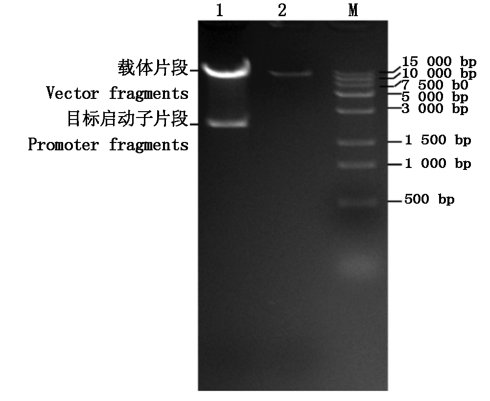 利用双酶切法将克隆的启动子片段pGmDGAT1A连接到植物表达载体pCAMBIA1381Z(有GUS,无启动子)上。将构建好的植物表达载体pCAMBIA1381Z-pGmDGAT1A转化大肠杆菌DH5α后挑选阳性克隆测序,序列比对结果正确。进一步利用限制性内切酶BamH Ⅰ和Pst Ⅰ进行酶切验证,结果表明,表达载体pCAMBIA1381Z-pGmDGAT1A可被切为2个片段,分别为2 192 bp的目标基因片段和载体片段,且载体片段与pCAMBIA1381Z空载体酶切片段的大小一致(图2),表明表达载体构建成功。