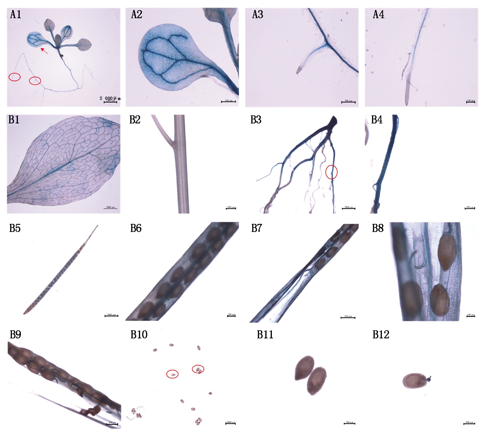 拟南芥植株的叶片(B1)、茎(B2)、根(B3)、根对应位置放大图(B4)、角果(B5-B9)、发育的种子(B10)和种子对应位置放大图(B11-B12)。