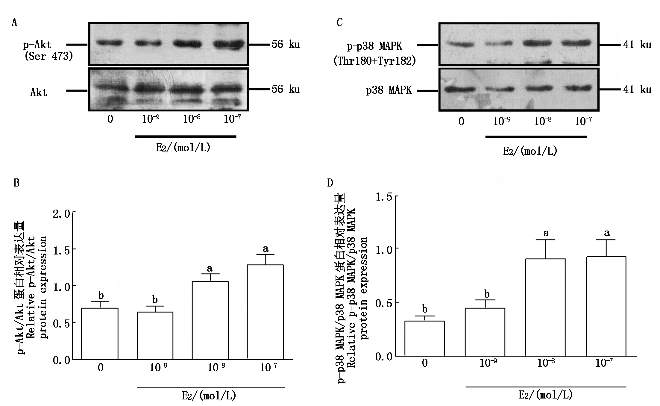 图3 不同浓度E2对Akt和p38 MAPK磷酸化的影响