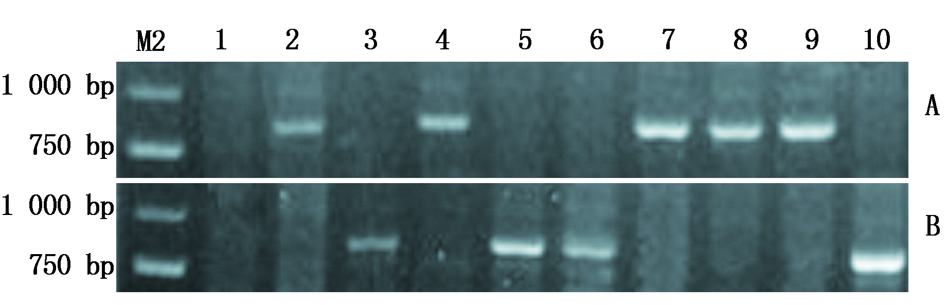 A. TaNRX-B1a单倍型的检测结果;B.TaNRX-B1b单倍型的检测结果;M2.DNA Marker DL2000;1.09智引3号;2.墨特大;3.墨S139;4.萨尔斯堡;5.爱丁堡B;6.非黑土地24;7.OK.95571;8.美国-2;9.野猫;10.NSR-5。