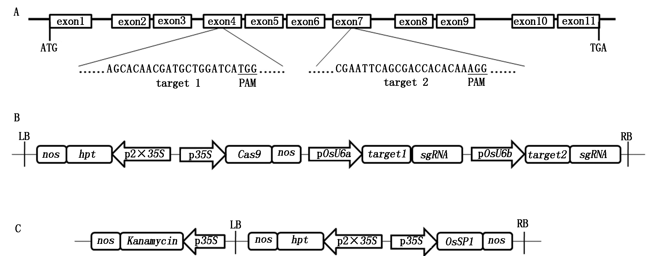 exon1~11.外显子1~11;LB.左边界;nos. nos终止子;hpt.潮霉素B磷酸转移酶基因;p2×35S. 2×35S启动子;p35S.35S启动子;Cas9.Cas9蛋白基因;pOsU6a.OsU6a启动子;target1.靶序列1;sgRNA.gRNA编码序列;pOsU6b.OsU6b启动子;target2.靶序列2;RB.右边界;Kanamycin.卡那霉素抗性基因;OsSP1.OsSP1基因。