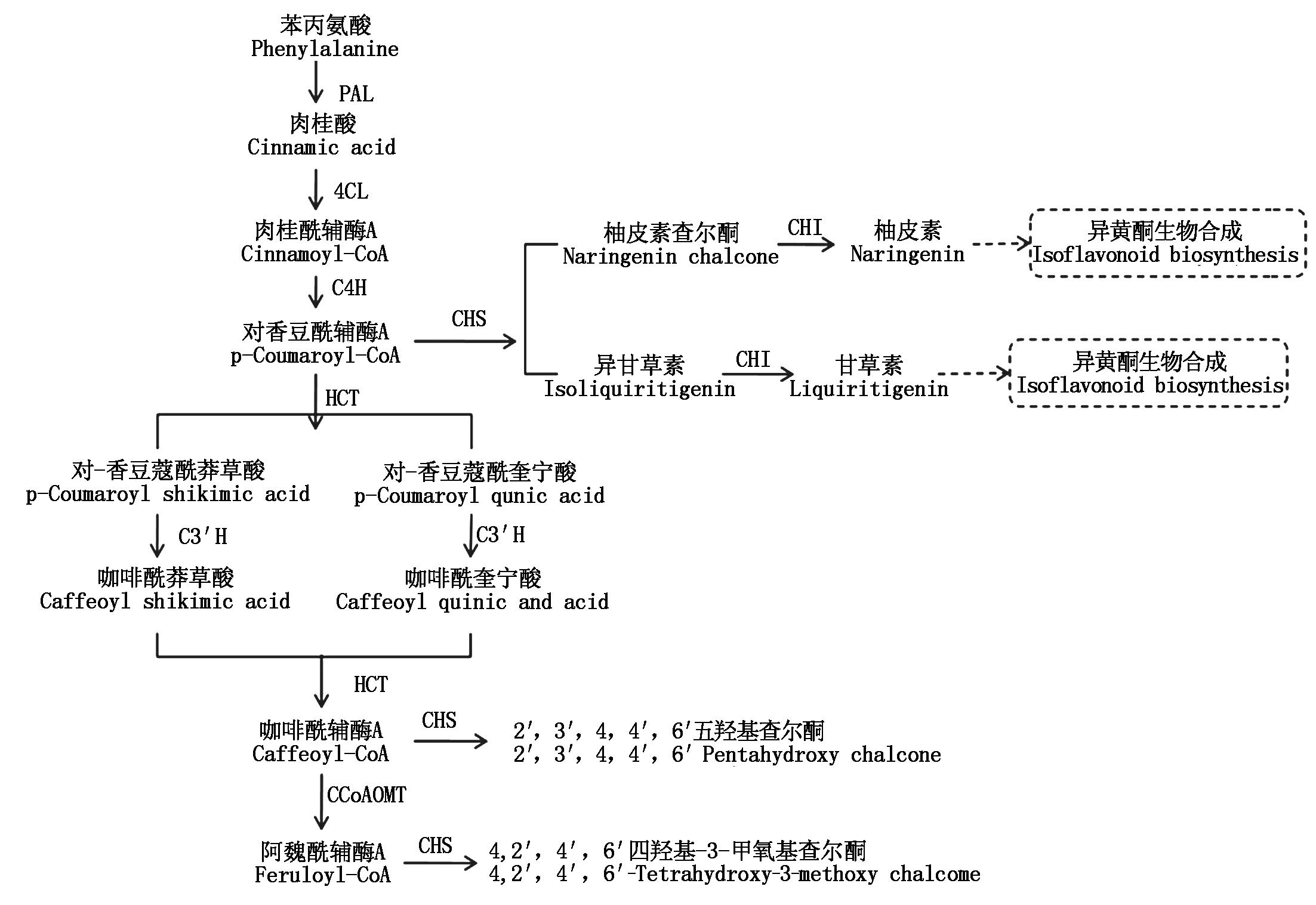2.2.4 黄酮类生物合成基因的鉴定 黄酮类是植物的苯丙氨酸代谢过程中产生的植物次生代谢产物,是一类由肉桂酰辅酶A侧链延长后环化形成以苯色酮环为基础的酚类化合物。异黄酮类物质是粉葛的主要活性成分,其中如葛根素、鸢尾苷元和鸢尾苷,是粉葛的主要的药用成分之一[15]。根据粉葛的转录组数据绘制其黄酮类生物合成代谢途径(图3)。在苯丙酸生物合成途径中,苯丙氨酸为底物,由苯丙氨酸解氨酶(Phenylalanine ammonialyase,PAL)将氨基基团从苯丙氨酸分子中移除而形成了肉桂酸(Cinnamic acid);然后在4-香豆酸-CoA连接酶(4-coumarate-CoA ligase,4CL)和肉桂酸-4羟化酶(Cinnamic acid 4-hydroxylase,C4H/CYP73A)作用下,在肉桂酸分子中添加上一个羟基基团而形成对-香豆酸(p-Coumarate);其侧链结合辅酶A分子(CoA),从而转变为对-香豆酸辅酶A分子(p-Coumarate-CoA),作为黄酮类化合物合成的起始底物。对-香豆酰辅酶A在查尔酮合酶(Chalcone synthase,CHS)的催化下产生柚皮素查尔酮或异甘草素,经查尔酮异构酶(Chalcone isomerase,CHI)作用,分别形成柚皮素或甘草素;之后,柚皮素作为中间产物进入代谢途径,甘草素作为底物进入异黄酮生物合成途径。除此之外,对-香豆酰辅酶A在莽草酸O-羟基肉桂酰基转移酶(Shikimic acid O-hydroxy cinnamoyltransferas,HCT)、5-O-(4-香豆蔻酰基)-D-奎宁酸3′-单加氧酶(5-O-(4-coumaroyl)-D-quinate 3′-monooxygenase,C3′H)作用下形成咖啡酰-CoA,经查尔酮合酶催化形成2′,3,4,4′,6′五羟基查尔酮(2′,3,4,4′,6′Pentahydroxy chalcome);或经咖啡酰辅酶A O-甲基转移酶 (Caffeoyl-CoA O-methyltransferase,CCoAOMT)催化形成阿魏酰辅酶A,再由查尔酮合酶催化形成4,2′,4′,6′,四羟基-3-甲氧基查尔酮(4,2′,4′,6′,-Tetrahydroxy-3-methoxy chalcome)。甘葛藤黄酮类的合成在不同酶的催化下参与复杂的代谢过程,产生的次生代谢产物较多。在甘葛藤转录组数据中,与黄酮类合成相关的基因110个,其中,26个编码HCT,3个编码CHS,7个编码CHI(表3)。