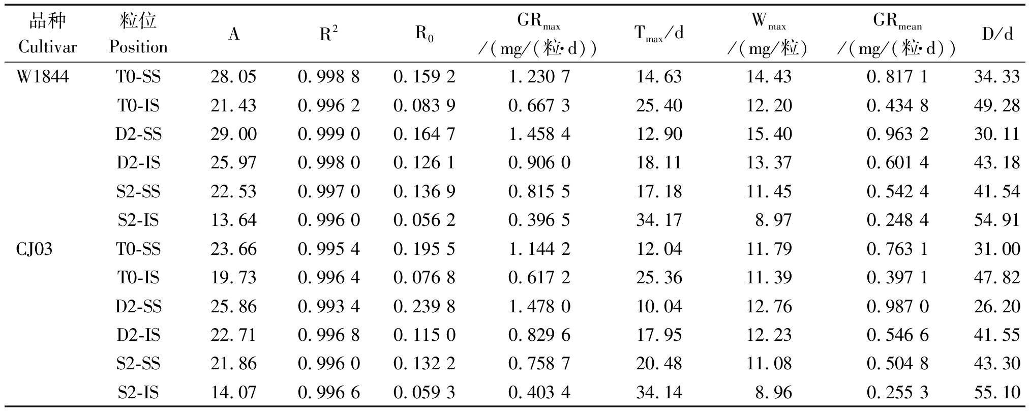 品种Cultivar粒位PositionAR2R0GRmax/(mg/(粒·d))Tmax/dWmax/(mg/粒)GRmean/(mg/(粒·d))D/dW1844T0-SS28.050.998 80.159 21.230 714.6314.430.817 134.33T0-IS21.430.996 20.083 90.667 325.4012.200.434 849.28D2-SS29.000.999 00.164 71.458 412.9015.400.963 230.11D2-IS25.970.998 00.126 10.906 018.1113.370.601 443.18S2-SS22.530.997 00.136 90.815 517.1811.450.542 441.54S2-IS13.640.996 00.056 20.396 534.178.970.248 454.91CJ03T0-SS23.660.995 40.195 51.144 212.0411.790.763 131.00T0-IS19.730.996 40.076 80.617 225.3611.390.397 147.82D2-SS25.860.993 40.239 81.478 010.0412.760.987 026.20D2-IS22.710.996 80.115 00.829 617.9512.230.546 641.55S2-SS21.860.996 00.132 20.758 720.4811.080.504 843.30S2-IS14.070.996 60.059 30.403 434.148.960.255 355.10