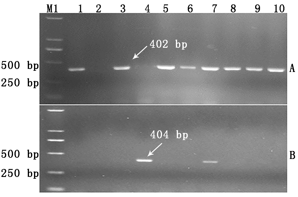 A.TaCwi-A1a单倍型的检测结果;B.TaCwi-A1b单倍型的检测结果。M1.DNA Marker DL2000;1.澳阿优1号;2.KPL-1;3.阿大学AGT-②;4.鸟麦;5.攀道拉;6.智矮早;7.硬质博莱特;8.CL0401;9.CL0438;10.CL0442。