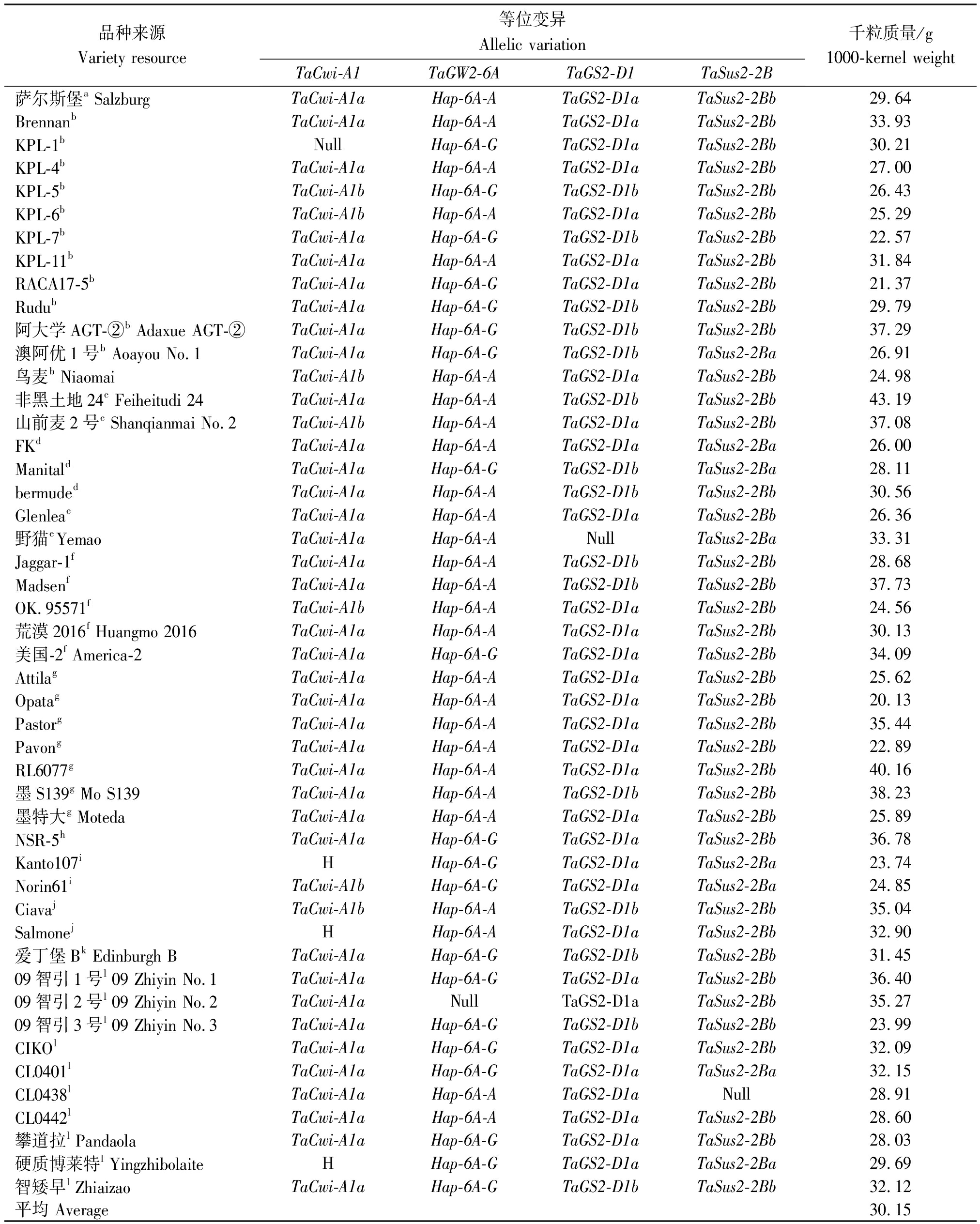 品种来源Variety resource等位变异Allelic variationTaCwi-A1TaGW2-6ATaGS2-D1TaSus2-2B千粒质量/g1000-kernel weight萨尔斯堡a SalzburgTaCwi-A1aHap-6A-ATaGS2-D1aTaSus2-2Bb29.64BrennanbTaCwi-A1aHap-6A-ATaGS2-D1aTaSus2-2Bb33.93KPL-1bNullHap-6A-GTaGS2-D1aTaSus2-2Bb30.21KPL-4bTaCwi-A1aHap-6A-ATaGS2-D1aTaSus2-2Bb27.00KPL-5bTaCwi-A1bHap-6A-GTaGS2-D1bTaSus2-2Bb26.43KPL-6bTaCwi-A1bHap-6A-ATaGS2-D1aTaSus2-2Bb25.29KPL-7bTaCwi-A1aHap-6A-GTaGS2-D1bTaSus2-2Bb22.57KPL-11bTaCwi-A1aHap-6A-ATaGS2-D1aTaSus2-2Bb31.84RACA17-5bTaCwi-A1aHap-6A-GTaGS2-D1aTaSus2-2Bb21.37RudubTaCwi-A1aHap-6A-GTaGS2-D1bTaSus2-2Bb29.79阿大学AGT-②b Adaxue AGT-②TaCwi-A1aHap-6A-GTaGS2-D1bTaSus2-2Bb37.29澳阿优1号b Aoayou No.1TaCwi-A1aHap-6A-GTaGS2-D1bTaSus2-2Ba26.91鸟麦b NiaomaiTaCwi-A1bHap-6A-ATaGS2-D1aTaSus2-2Bb24.98非黑土地24c Feiheitudi 24TaCwi-A1aHap-6A-ATaGS2-D1bTaSus2-2Bb43.19山前麦2号c Shanqianmai No.2TaCwi-A1bHap-6A-ATaGS2-D1aTaSus2-2Bb37.08FKdTaCwi-A1aHap-6A-ATaGS2-D1aTaSus2-2Ba26.00ManitaldTaCwi-A1aHap-6A-GTaGS2-D1bTaSus2-2Ba28.11bermudedTaCwi-A1aHap-6A-ATaGS2-D1bTaSus2-2Bb30.56GlenleaeTaCwi-A1aHap-6A-ATaGS2-D1aTaSus2-2Bb26.36野猫eYemaoTaCwi-A1aHap-6A-ANullTaSus2-2Ba33.31Jaggar-1fTaCwi-A1aHap-6A-ATaGS2-D1bTaSus2-2Bb28.68MadsenfTaCwi-A1aHap-6A-ATaGS2-D1bTaSus2-2Bb37.73OK.95571fTaCwi-A1bHap-6A-ATaGS2-D1aTaSus2-2Bb24.56荒漠2016f Huangmo 2016TaCwi-A1aHap-6A-ATaGS2-D1aTaSus2-2Bb30.13美国-2f America-2TaCwi-A1aHap-6A-GTaGS2-D1aTaSus2-2Bb34.09AttilagTaCwi-A1aHap-6A-ATaGS2-D1aTaSus2-2Bb25.62OpatagTaCwi-A1aHap-6A-ATaGS2-D1aTaSus2-2Bb20.13PastorgTaCwi-A1aHap-6A-ATaGS2-D1aTaSus2-2Bb35.44PavongTaCwi-A1aHap-6A-ATaGS2-D1aTaSus2-2Bb22.89RL6077gTaCwi-A1aHap-6A-ATaGS2-D1aTaSus2-2Bb40.16墨S139g Mo S139TaCwi-A1aHap-6A-ATaGS2-D1bTaSus2-2Bb38.23墨特大g MotedaTaCwi-A1aHap-6A-ATaGS2-D1aTaSus2-2Bb25.89NSR-5hTaCwi-A1aHap-6A-GTaGS2-D1aTaSus2-2Bb36.78Kanto107iHHap-6A-GTaGS2-D1aTaSus2-2Ba23.74Norin61iTaCwi-A1bHap-6A-GTaGS2-D1aTaSus2-2Ba24.85CiavajTaCwi-A1bHap-6A-ATaGS2-D1bTaSus2-2Bb35.04SalmonejHHap-6A-ATaGS2-D1aTaSus2-2Bb32.90爱丁堡Bk Edinburgh BTaCwi-A1aHap-6A-GTaGS2-D1bTaSus2-2Bb31.4509智引1号l 09 Zhiyin No.1TaCwi-A1aHap-6A-GTaGS2-D1aTaSus2-2Bb36.4009智引2号l 09 Zhiyin No.2TaCwi-A1aNullTaGS2-D1aTaSus2-2Bb35.2709智引3号l 09 Zhiyin No.3TaCwi-A1aHap-6A-GTaGS2-D1bTaSus2-2Bb23.99CIKOlTaCwi-A1aHap-6A-GTaGS2-D1aTaSus2-2Bb32.09CL0401lTaCwi-A1aHap-6A-GTaGS2-D1aTaSus2-2Ba32.15CL0438lTaCwi-A1aHap-6A-ATaGS2-D1aNull28.91CL0442lTaCwi-A1aHap-6A-ATaGS2-D1aTaSus2-2Bb28.60攀道拉l PandaolaTaCwi-A1aHap-6A-GTaGS2-D1aTaSus2-2Bb28.03硬质博莱特l YingzhibolaiteHHap-6A-GTaGS2-D1aTaSus2-2Ba29.69智矮早l ZhiaizaoTaCwi-A1aHap-6A-GTaGS2-D1bTaSus2-2Bb32.12平均 Average30.15