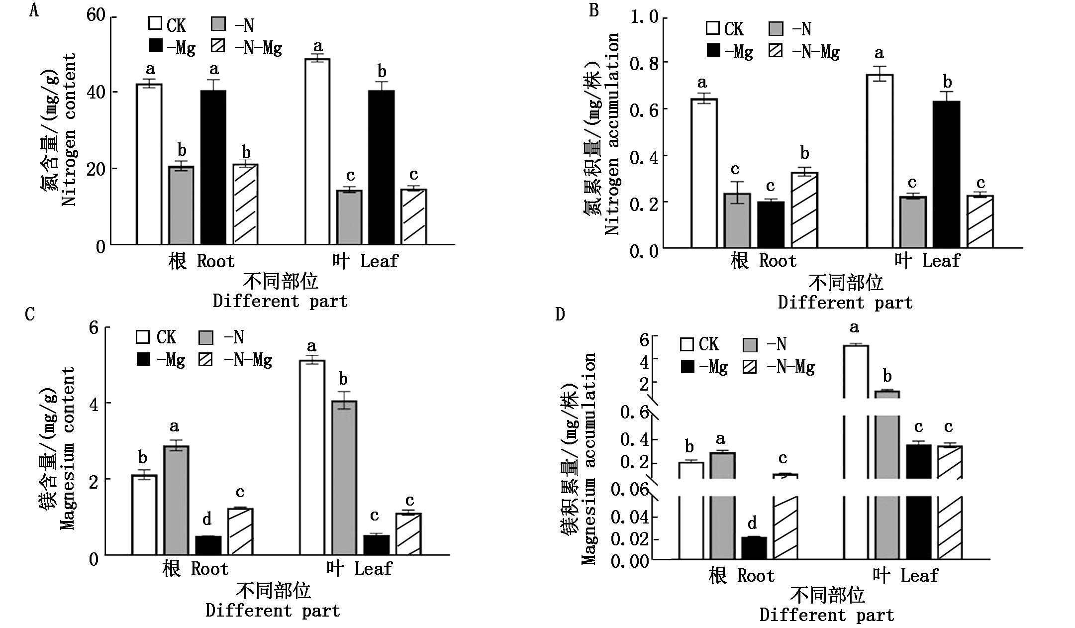 Fig.2 Effects of nitrogen or magnesium deficiency stress on nitrogen and