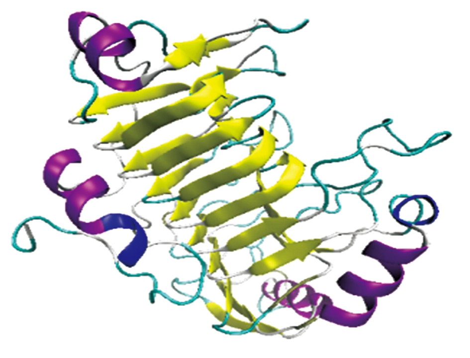 2.4.4 高级结构分析 从PDB数据库中选取了同源性最高的细菌来源PEL蛋白空间结构(PDB:2EWE)为模板,对PelG403进行同源建模,结果表明(图7):PelG403主要由螺旋和卷曲构成,与二级结构预测的结果基本相符;且属于典型的右手β-螺旋结构,与Pfam结构域分析一致,表明PelG403经同源建模得到的蛋白三维结构可信度高。