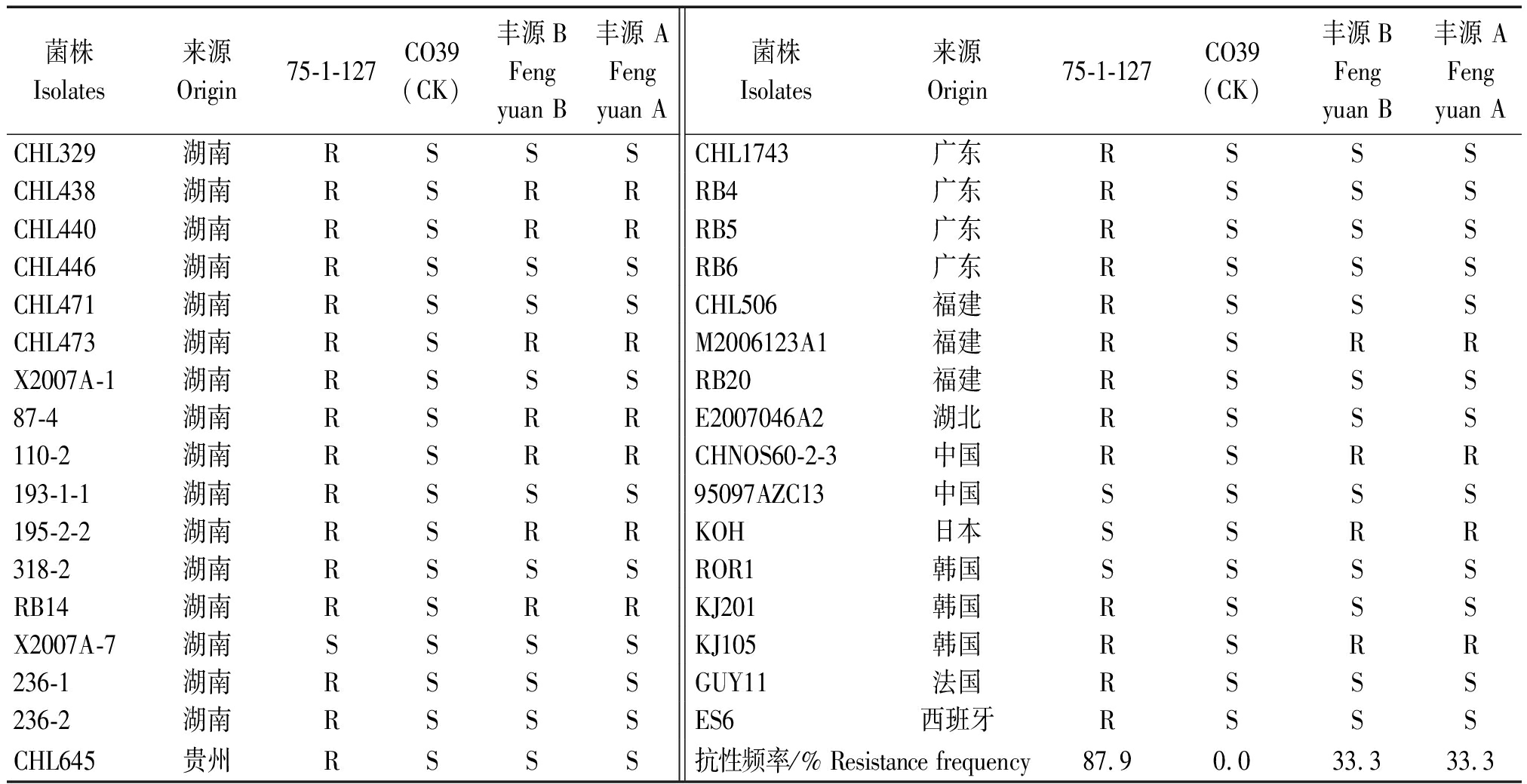 菌株Isolates来源Origin75-1-127CO39(CK)丰源BFengyuan B丰源 AFengyuan A菌株Isolates来源Origin75-1-127CO39(CK)丰源BFengyuan B丰源 AFengyuan ACHL329湖南RSSSCHL1743广东RSSSCHL438湖南RSRRRB4广东RSSSCHL440湖南RSRRRB5广东RSSSCHL446湖南RSSSRB6广东RSSSCHL471湖南RSSSCHL506福建RSSSCHL473湖南RSRRM2006123A1福建RSRRX2007A-1湖南RSSSRB20福建RSSS87-4湖南RSRRE2007046A2湖北RSSS110-2湖南RSRRCHNOS60-2-3中国RSRR193-1-1湖南RSSS95097AZC13中国SSSS195-2-2湖南RSRRKOH日本SSRR318-2湖南RSSSROR1韩国SSSSRB14湖南RSRRKJ201韩国RSSSX2007A-7湖南SSSSKJ105韩国RSRR236-1湖南RSSSGUY11法国RSSS236-2湖南RSSSES6西班牙RSSSCHL645贵州RSSS抗性频率/% Resistance frequency87.90.033.333.3