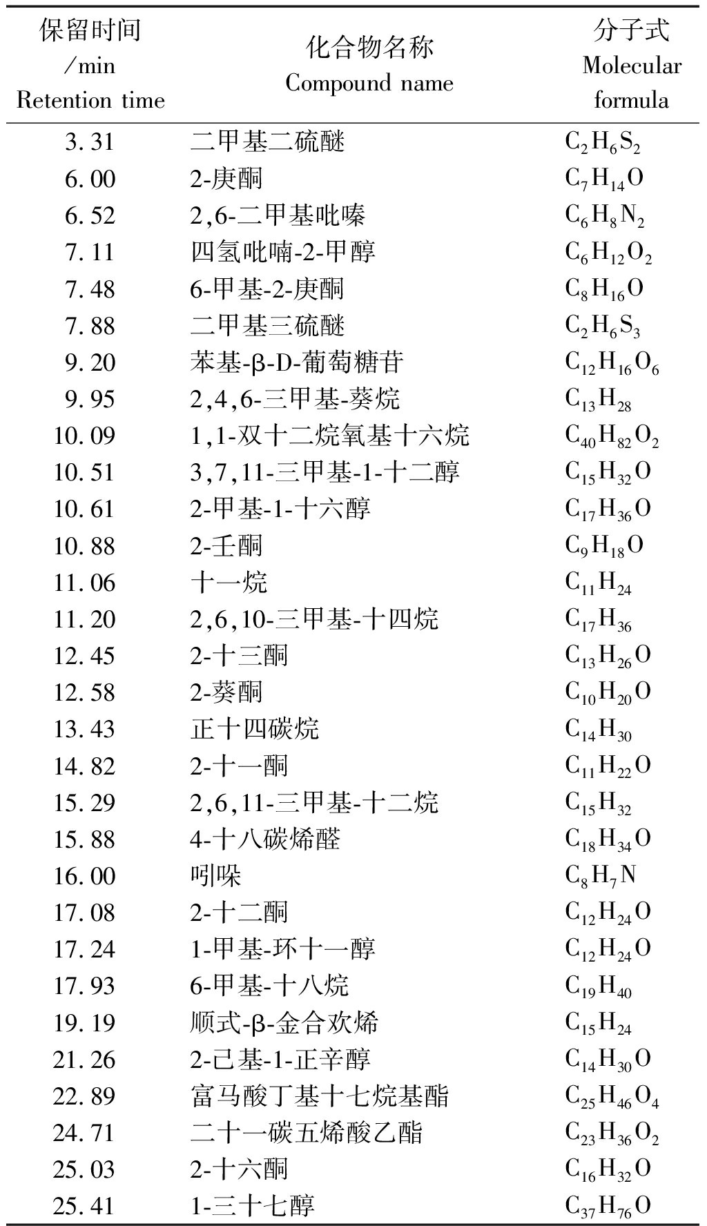 用顶空-固相微萃取法收集内生细菌S258所产挥发性有机物,并用GC-MS分析其挥发性有机物的组成。经 NIST 和 WILIY 质谱数据库自动检索,鉴定得到菌株S258产生的挥发性有机物包含30 种单体化合物,分别属于烷烃、烯烃、醇、酮、醚、醛、酯及杂环类(表2)。根据总离子流图的峰面积判断,主要气体成分为二甲基二硫醚(Dimethyl disulfide)和吲哚(Indole)。