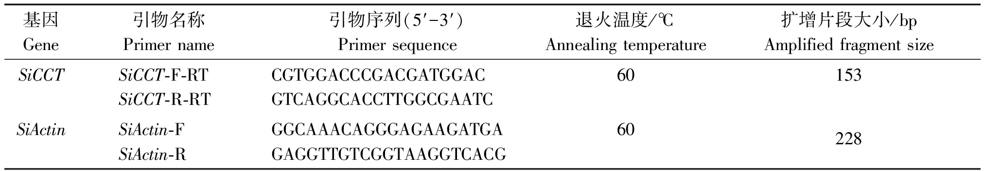 基因Gene引物名称Primer name引物序列(5′-3′)Primer sequence退火温度/℃Annealing temperature扩增片段大小/bpAmplified fragment sizeSiCCTSiCCT-F-RTSiCCT-R-RTCGTGGACCCGACGATGGACGTCAGGCACCTTGGCGAATC60153SiActinSiActin-FSiActin-RGGCAAACAGGGAGAAGATGAGAGGTTGTCGGTAAGGTCACG60228
