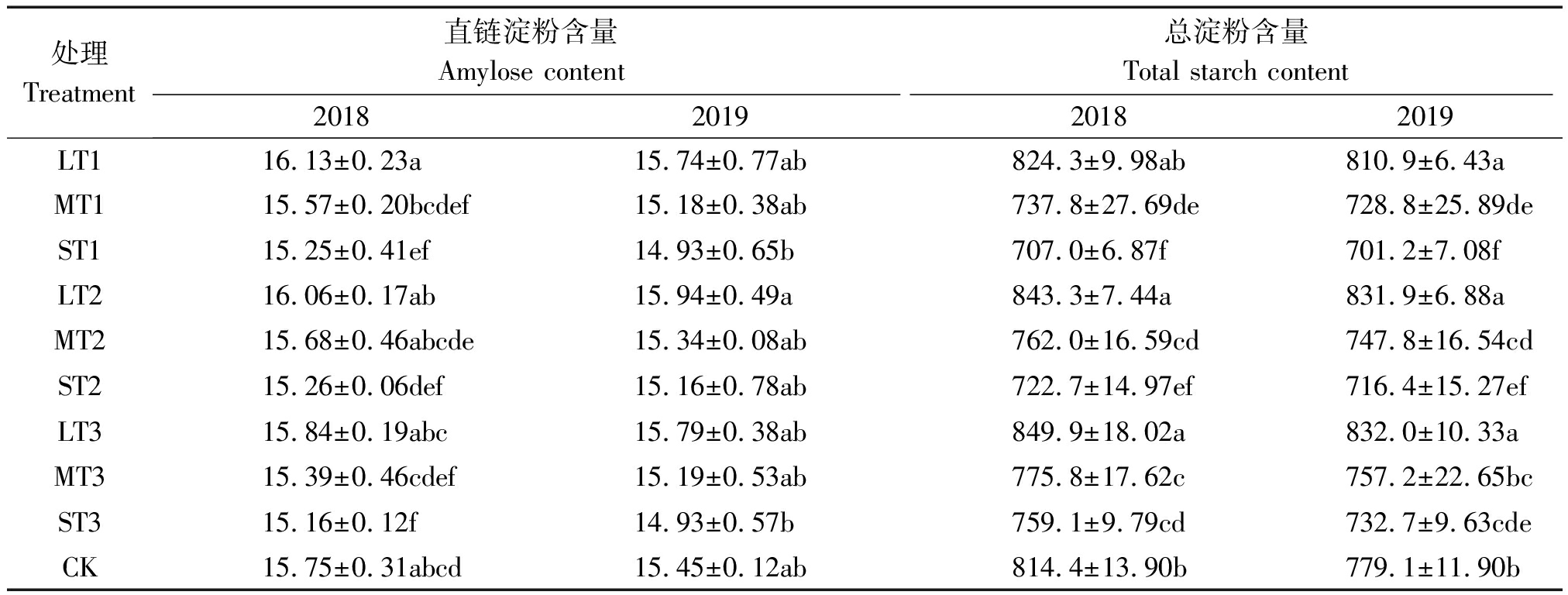 处理Treatment直链淀粉含量Amylose content总淀粉含量Total starch content2018201920182019LT116.13±0.23a15.74±0.77ab824.3±9.98ab810.9±6.43aMT115.57±0.20bcdef15.18±0.38ab737.8±27.69de728.8±25.89deST115.25±0.41ef14.93±0.65b707.0±6.87f701.2±7.08fLT216.06±0.17ab15.94±0.49a843.3±7.44a831.9±6.88aMT215.68±0.46abcde15.34±0.08ab762.0±16.59cd747.8±16.54cdST215.26±0.06def15.16±0.78ab722.7±14.97ef716.4±15.27efLT315.84±0.19abc15.79±0.38ab849.9±18.02a832.0±10.33aMT315.39±0.46cdef15.19±0.53ab775.8±17.62c757.2±22.65bcST315.16±0.12f14.93±0.57b759.1±9.79cd732.7±9.63cdeCK15.75±0.31abcd15.45±0.12ab814.4±13.90b779.1±11.90b