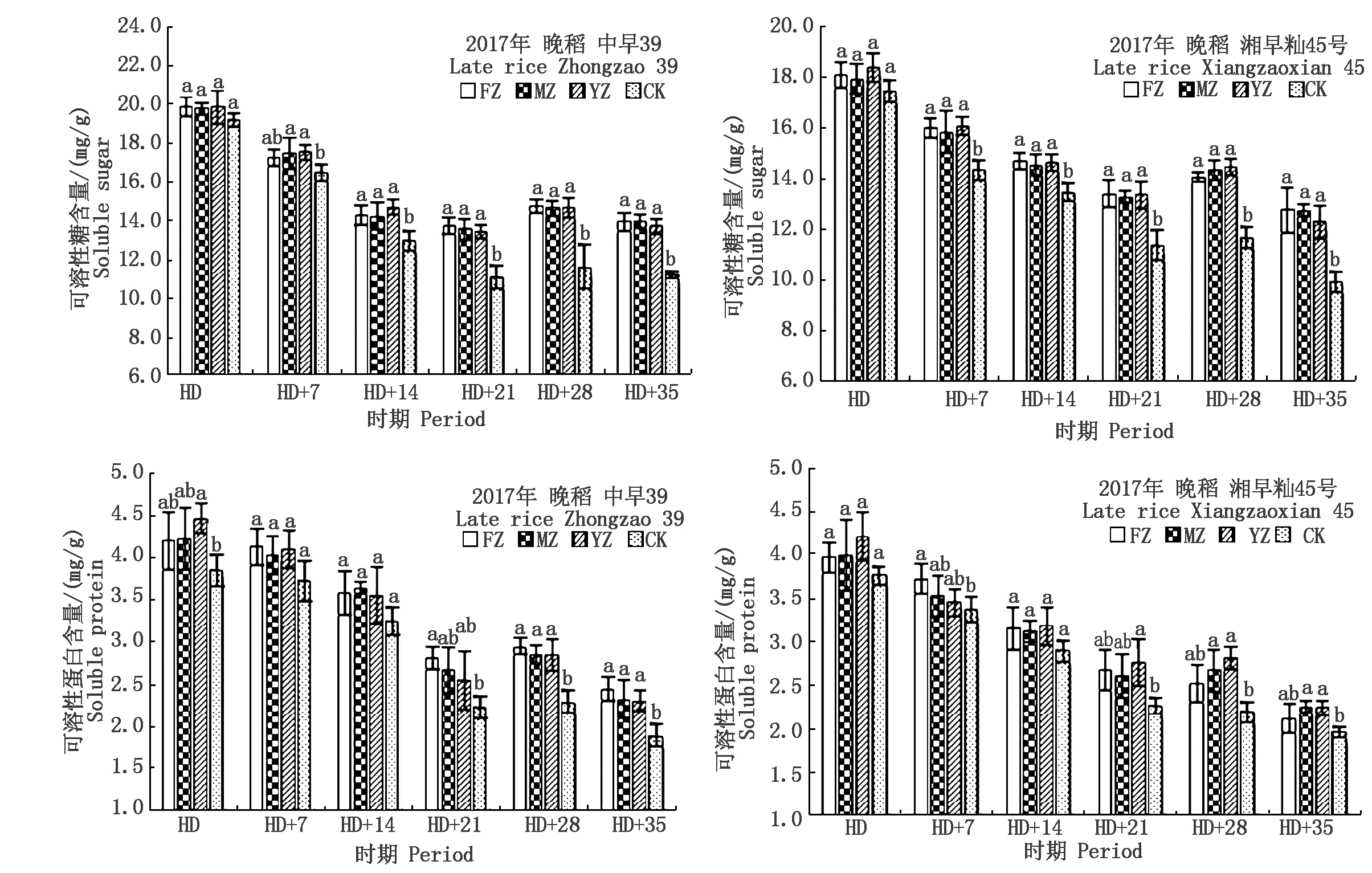 由图4可知,2017年晚稻的2个品种在齐穗后不同栽培处理水稻剑叶可溶性糖和可溶性蛋白含量均随生育期推进呈不断下降的变化趋势;中早39和湘早籼45号的FZ、MZ和YZ处理的剑叶可溶性糖和可溶性蛋白含量均不同程度高于CK 处理,其中中早39的FZ、MZ、YZ和CK处理的剑叶可溶性糖含量在齐穗+14 d-齐穗+35 d的增幅为9.38%~26.79%,且均达到显著性差异(P<0.05),且可溶性