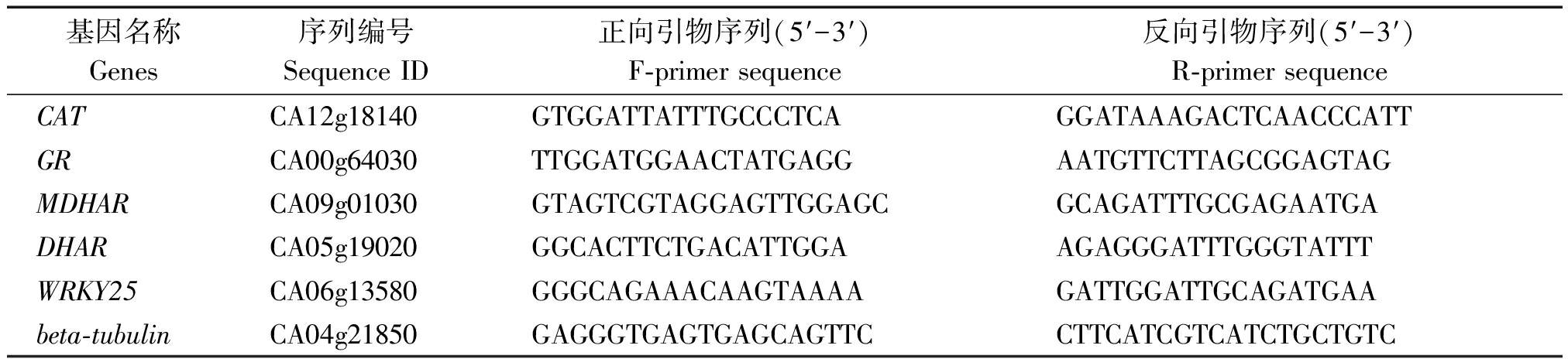 基因名称Genes序列编号Sequence ID正向引物序列(5′-3′)F-primer sequence反向引物序列(5′-3′)R-primer sequenceCATCA12g18140GTGGATTATTTGCCCTCAGGATAAAGACTCAACCCATTGRCA00g64030TTGGATGGAACTATGAGGAATGTTCTTAGCGGAGTAGMDHARCA09g01030GTAGTCGTAGGAGTTGGAGCGCAGATTTGCGAGAATGADHARCA05g19020GGCACTTCTGACATTGGAAGAGGGATTTGGGTATTTWRKY25CA06g13580GGGCAGAAACAAGTAAAAGATTGGATTGCAGATGAAbeta-tubulinCA04g21850GAGGGTGAGTGAGCAGTTCCTTCATCGTCATCTGCTGTC