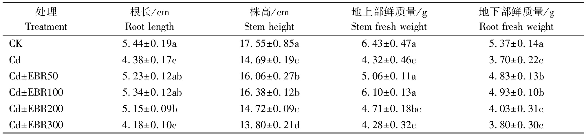 处理Treatment根长/cmRoot length株高/cm Stem height地上部鲜质量/gStem fresh weight地下部鲜质量/gRoot fresh weightCK5.44±0.19a17.55±0.85a6.43±0.47a5.37±0.14aCd4.38±0.17c14.69±0.19c4.32±0.46c3.70±0.22cCd±EBR505.23±0.12ab16.06±0.27b5.06±0.11a4.83±0.13bCd±EBR1005.34±0.12ab16.38±0.12b6.10±0.13a4.93±0.10bCd±EBR2005.15±0.09b14.72±0.09c4.71±0.18bc4.03±0.31cCd±EBR3004.18±0.10c13.80±0.21d4.28±0.32c3.80±0.30c