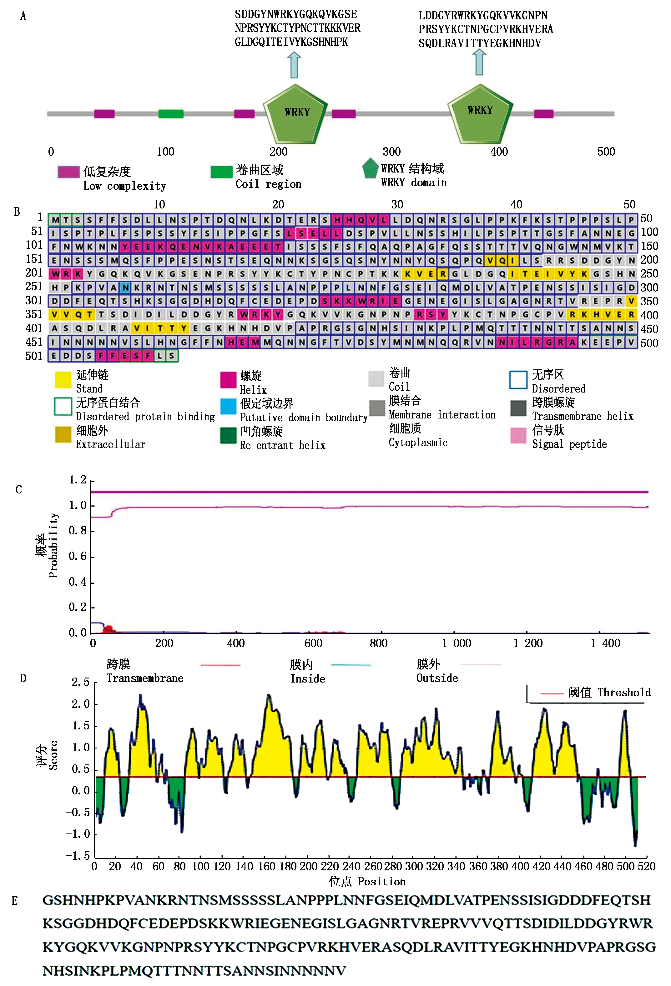 利用生物信息学预测网站ExPASy对MsWRKY33蛋白理化性质进行预测,该蛋白全长511 aa,蛋白分子式为C1129H1788N320O371S10,理论分子量为57.16 ku,理论等电点为7.02,不稳定指数为50.6,预测是一个不稳定蛋白。此外,该蛋白含有21个酸性氨基酸残基和21个碱性氨基酸残基,平均疏水性为-0.314,由此说明MsWRKY33蛋白可能是一个亲水性蛋白。使用SMART预测MsWRKY33蛋白在200~450 aa的位置有2个WRKY结构域(图1-A)。二级结构预测显示MsWRKY33蛋白主要由无规则卷曲和延伸链结构组成,不具有信号肽(图1-B)和跨膜结构域(图1-C),不属于分泌型蛋白。