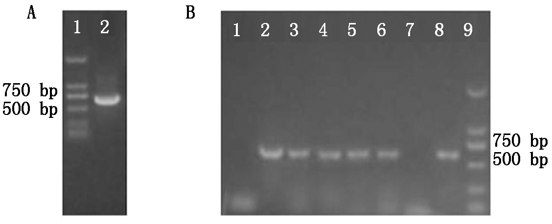 A.MsWRKY33抗原序列克隆:1.Marker;2.MsWRKY33抗原序列;B.重组质粒pET-MsWRKY33的PCR检测:1.阴性对照;2.阳性对照;3-8.单克隆;9.Marker。