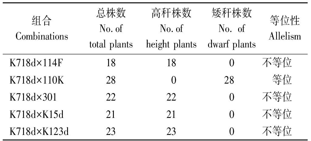 组合Combinations总株数No.oftotal plants高秆株数No.ofheight plants矮秆株数No. ofdwarf plants等位性AllelismK718d×114F18180不等位K718d×110K28028 等位K718d×30122220不等位K718d×K15d21210不等位K718d×K123d23230不等位