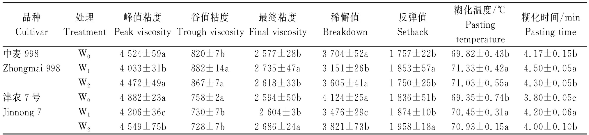 品种Cultivar处理Treatment峰值粘度Peak viscosity谷值粘度Trough viscosity最终粘度Final viscosity稀懈值Breakdown反弹值Setback糊化温度/℃Pasting temperature糊化时间/minPasting time中麦998W04 524±59a820±7b2 577±28b3 704±52a1 757±22b69.82±0.43b4.17±0.15bZhongmai 998W14 033±31b882±14a2 735±47a3 151±26b1 853±57a71.33±0.42a4.50±0.05aW24 472±49a867±7a2 618±33b3 605±41a1 750±25b71.03±0.55a4.30±0.05b津农7号W04 882±23a758±2a2 594±50b4 124±25a1 836±51b69.35±0.74b3.80±0.05cJinnong 7W14 206±36c730±7b2 604±3b3 476±29c1 874±10b70.45±0.31a4.20±0.06aW24 549±75b728±7b2 686±24a3 821±73b1 958±18a70.93±0.15a4.00±0.10b