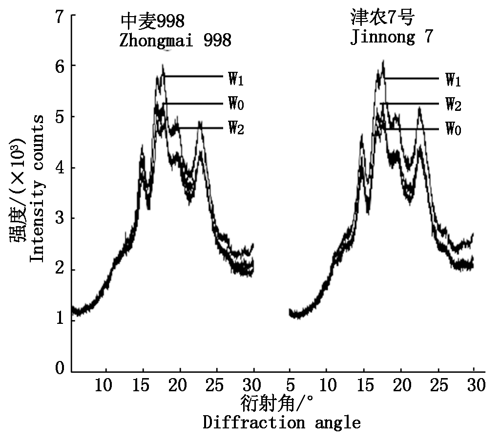小麦籽粒淀粉构成物质的主要来源是花前营养器官中非结构碳水化合物的再动员和花后光合作用形成的即时产物,不同灌水次数使淀粉积累速率及淀粉组分含量产生差异,进而影响了淀粉热力学特性、糊化特性、晶体特性[15, 24-25]。糊化特性是影响小麦籽粒淀粉品质的重要因素[26],前人指出,除稀懈值外,水分对其他糊化特性具有显著的调节作用,且随灌水次数的增加或灌水时期的后移呈现下降趋势[27-28],而灌水次数对强筋小麦淀粉热力学特性的影响鲜见报道。本研究结果表明,仅春灌拔节水(W1)时提高了中麦998的热力学特性相关指标和津农7号的高峰温度、糊化焓;同时,也提高了中麦998的谷值粘度、最终粘度、反弹值、糊化温度、糊化时间和津农7号的糊化时间,这可能是因为此处理的淀粉在积累过程中导致淀粉结构排列更加规则、分子间的结合更加紧密,提高了糊化特性,解决了面包品质优良而面条品质一般的问题。籽粒中的淀粉以颗粒形式存在,淀粉颗粒分为结晶区和非结晶区,可以通过XRD衍射图谱证实[29]。本试验条件下,灌水次数没有改变籽粒淀粉的晶体类型,但两品种均在春灌拔节水(W1)时提高了淀粉结晶强度和相对结晶度,与宋霄君等[16]的干旱胁迫有助于提高相对结晶度的研究结果不一致,这可能由于不同品种特性引起的。