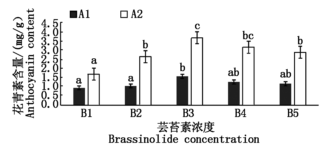 花青素是花色苷合成的前体物质,花青素含量可以较为直观表现出芸苔素对色苷合成的影响。由图2可知品种A2的花青素含量要高于品种A1,且不同浓度的芸苔素对菜豆花色苷合成产生了不同程度的影响。品种A1的表现为A1B3>A1B4>A1B5>A1B2>A1B1,且处理A1B3与空白处理A1B1和处理A1B2差异显著;品种A2表现为A2B3>A2B4>A2B5>A2B2>A2B1,且处理A2B3与空白对照A2B1差异显著。品种A1与品种A2相比较,品种A2的花青素含量要高于品种A1;其中处理A2B3花青素含量为最高。