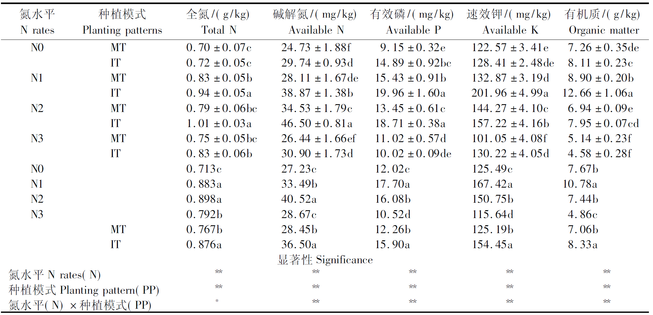 种植模式Planting patternsN0N1N2N3平均MeanMT3.41±0.30e 6.31±0.32c 8.41±0.64b4.88±0.20d5.75bIT3.55±0.40e9.47±0.75a10.29±0.81a6.05±0.22c7.34a