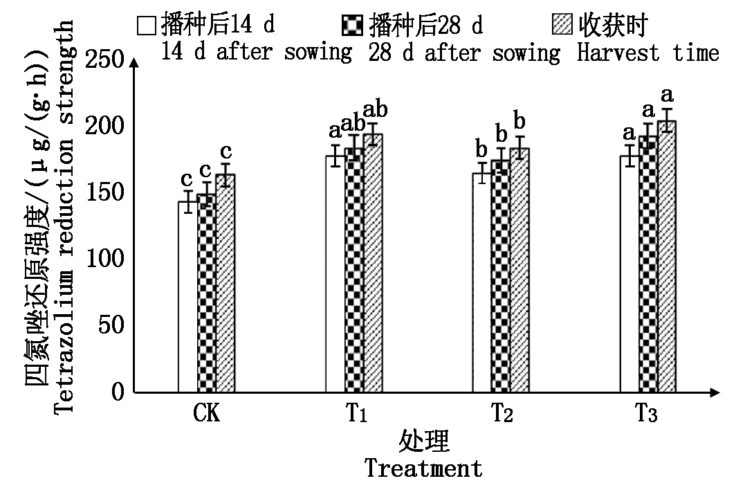 处理Treatments碱解氮含量/(mg/kg)Alkaline nitrogen content有效磷含量/(mg/kg)Available phosphorus content速效钾含量/(mg/kg)Available potassium content有机质含量/(mg/g)Organic matter contentCK51.63±1.13d10.27±0.13c68.6±1.26c11.4±0.02bT155.41±1.15c13.34±0.12bc91.9±1.23a13.5±0.03aT258.36±1.16b14.21±1.10b73.0±1.21bc11.3±0.03bT361.89±1.17a16.28±1.16a93.8±1.23a13.8±0.02a