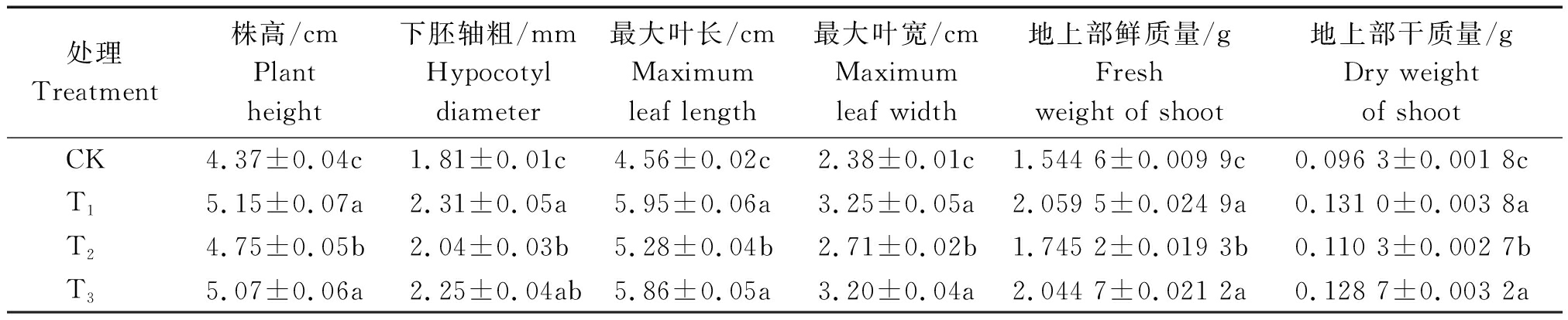 处理Treatment株高/cmPlant height下胚轴粗/mmHypocotyl diameter 最大叶长/cmMaximum leaf length 最大叶宽/cmMaximum leaf width 地上部鲜质量/gFresh weight of shoot 地上部干质量/gDry weight of shootCK4.37±0.04c1.81±0.01c4.56±0.02c2.38±0.01c1.544 6±0.009 9c0.096 3±0.001 8cT15.15±0.07a2.31±0.05a5.95±0.06a3.25±0.05a2.059 5±0.024 9a0.131 0±0.003 8aT24.75±0.05b2.04±0.03b5.28±0.04b2.71±0.02b1.745 2±0.019 3b0.110 3±0.002 7bT35.07±0.06a2.25±0.04ab5.86±0.05a3.20±0.04a2.044 7±0.021 2a0.128 7±0.003 2a