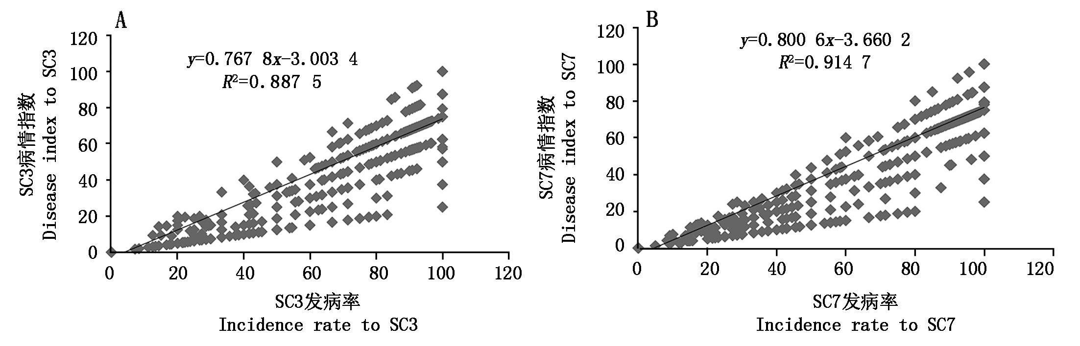 A.SC3发病率和病情指数间的线性方程;B.SC7发病率和病情指数间的线性方程。